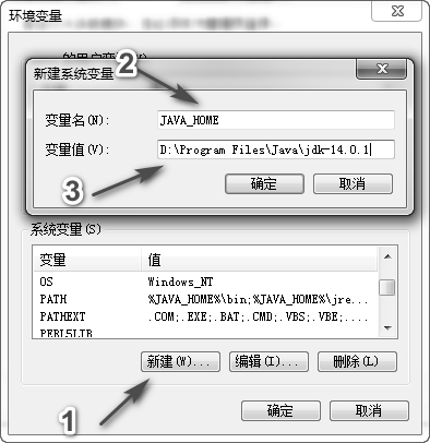 ① 单击系统变量下面的新建按钮,变量名为JAVA_HOME(代表JDK安装路径),变量值对应的是JDK的安装路径(本案例JDK的安装路径为D:\Program Files\Java\jdk-14.0.1),如图1.15所示。