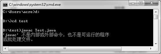 首先在计算机的“D:\test\”路径下创建一个Test.java文件,该程序的任务是输出test,代码基本同HelloWorld程序,只是输出内容不同。然后打开命令行窗口,切换路径,输入命令javac Test.java,结果报错,如图1.12所示。