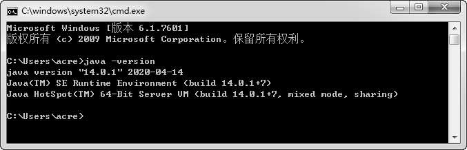 按Win+R组合键并输入cmd,打开命令行窗口,输入java –version,出现图1.18所示的内容则代表安装成功。如果安装失败,要重新检查是否缺漏某一安装步骤、环境变量设置正确与否。