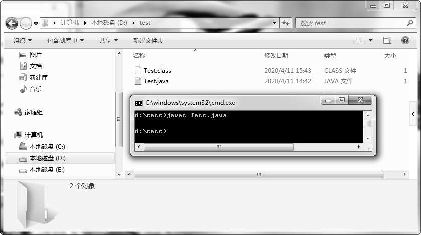 ③ 再次在D:\test路径下执行javac Test.java命令,结果这次编译成功,如图1.17所示,证明PATH环境变量起作用了。