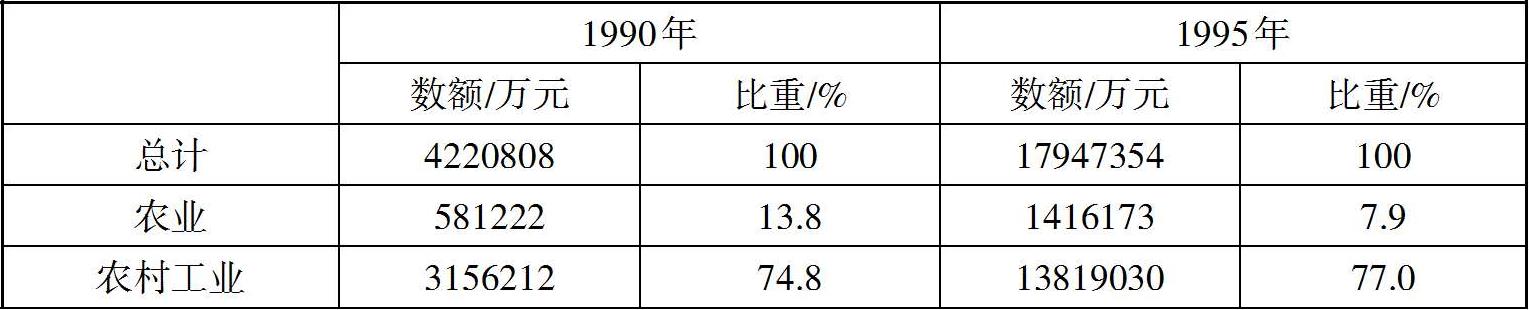 在这里,我们可以从农村社会总产值的构成情况和农村劳动力的就业情况两个方面对乡镇企业的发展带动农村工业化水平的提升进行评价。根据统计数据的可获得性,我们以苏州为例,分别对1990年和1995年苏州农村地区分行业的产值和就业构成情况进行分析。