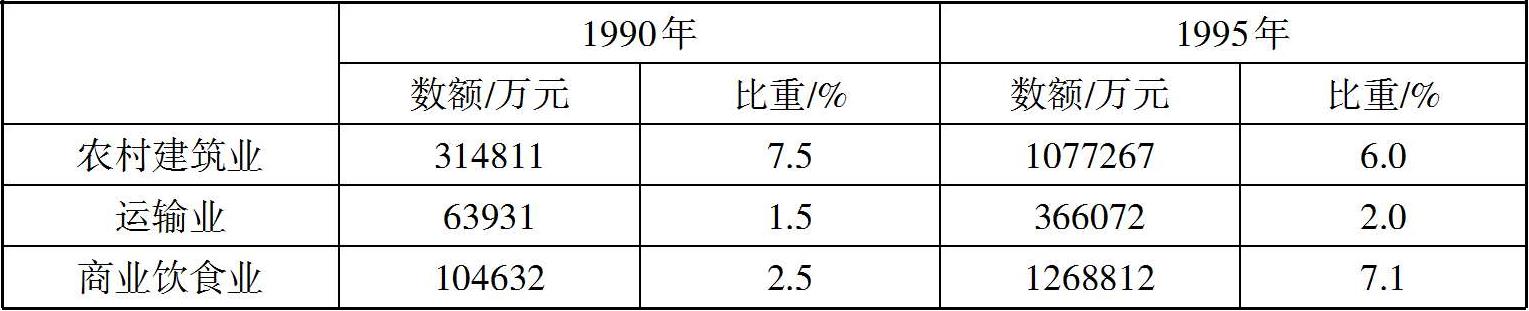 表2.2显示了苏州农村劳动力的就业构成情况。该表显示,1990年农村劳动力就业主要集中在工业和农林牧渔业,二者占全部农村劳动力人口的比重分别为40%和38.6%,到1995年,农村工业就业比重进一步上升为47.9%,而农林牧渔业就业比重则相应下降为27.2%。与此同时,与工业化发展相关的交通运输和邮电业、商贸、物流、仓储等产业的就业比重也有一定上升。