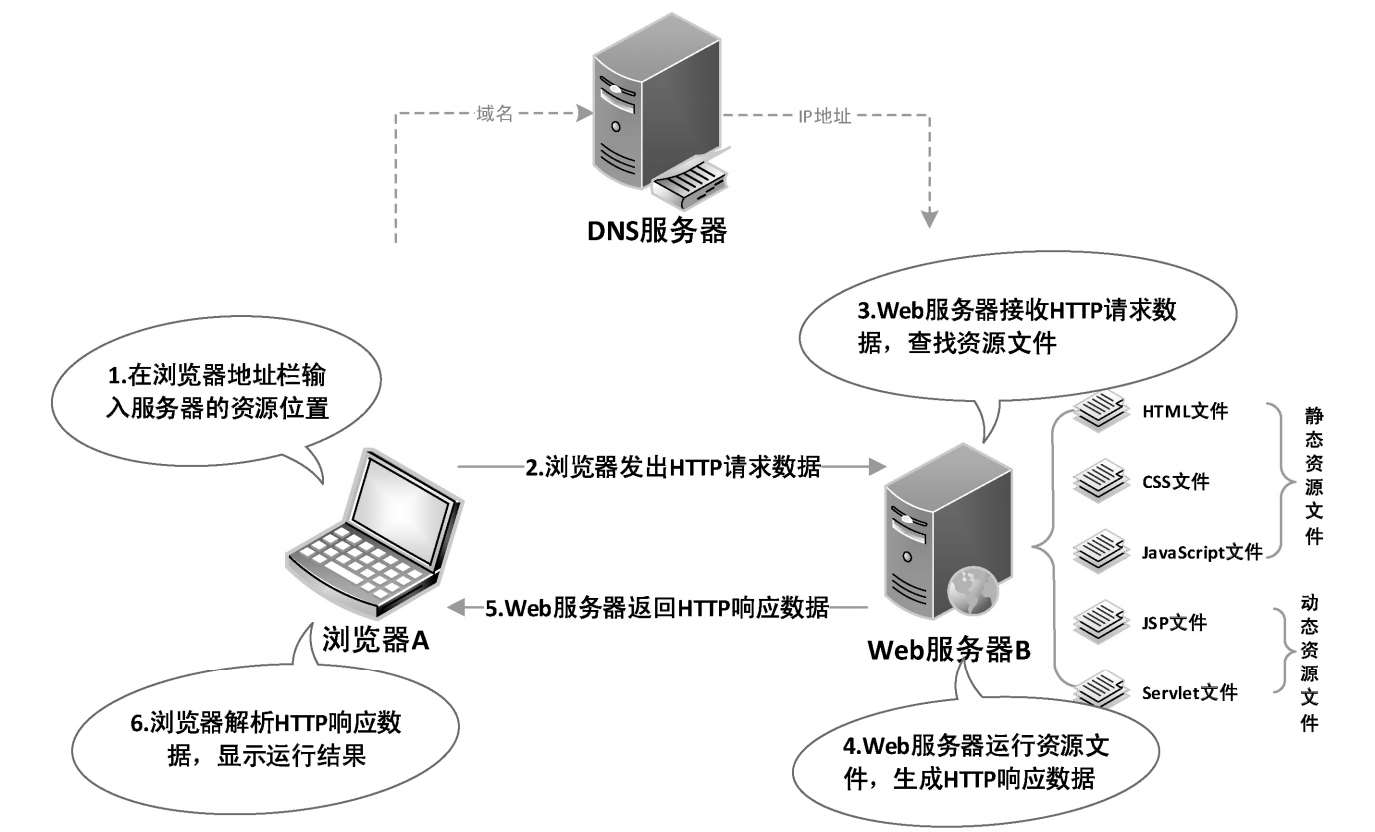 (1)当浏览器用户打开浏览器,输入URL或者单击超链接后,实际上是浏览器请求访问Web服务器的某个资源文件。这个过程称为浏览器向Web服务器发出HTTP请求数据。