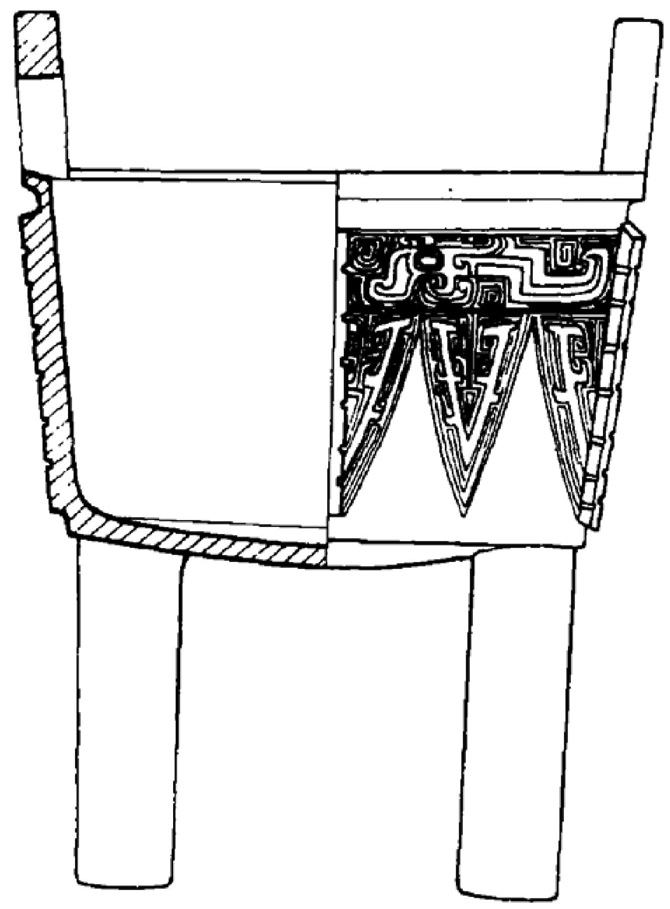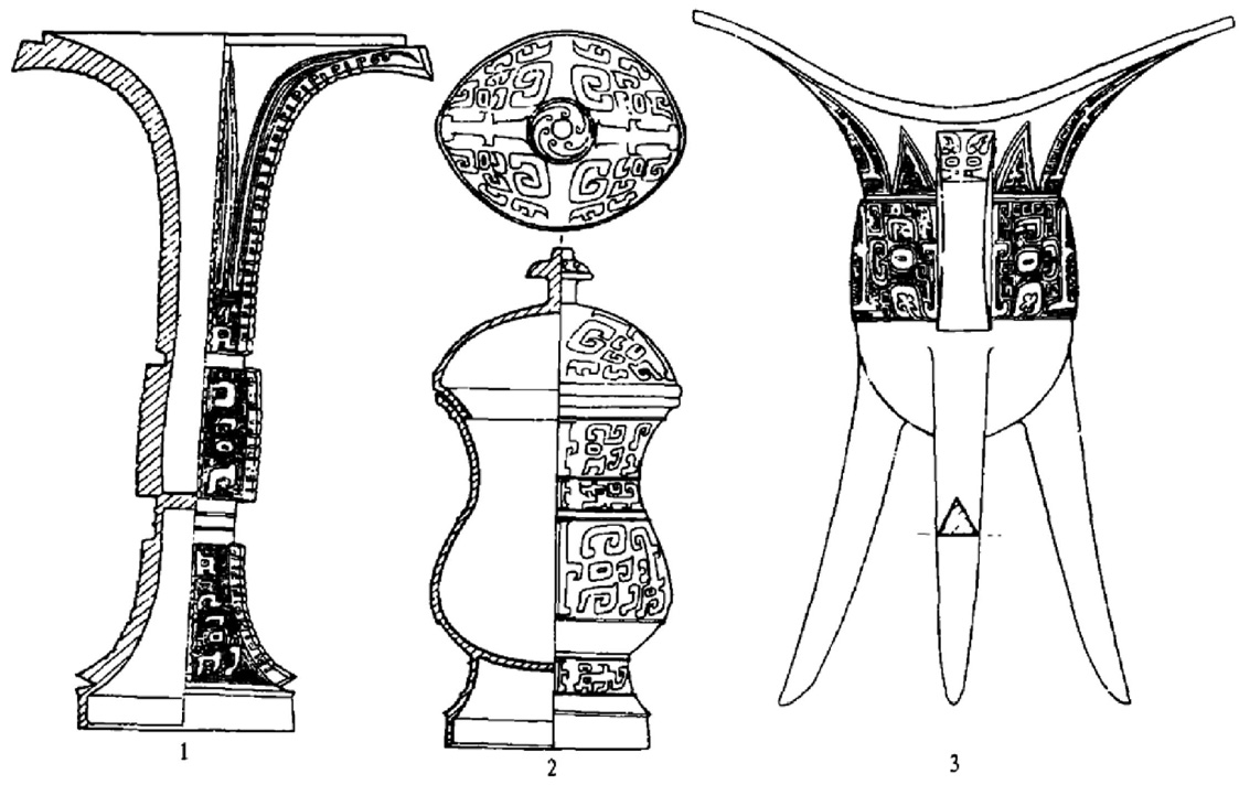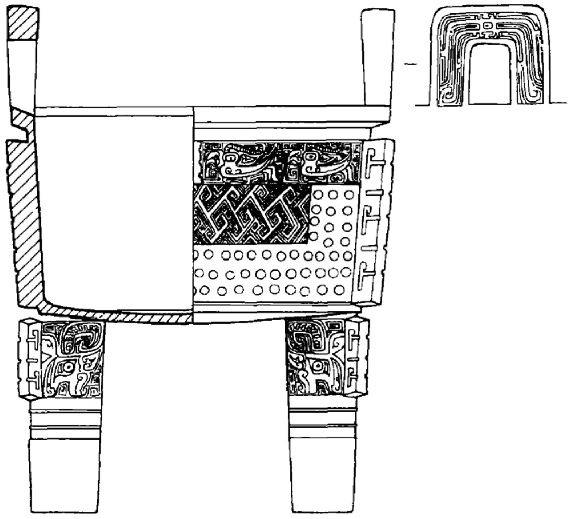 在殷代,方形器皿主要出于王室成员和高、中级贵族的墓葬,具体地说,方形器皿不见于1套觚、爵的墓,出2套觚、爵的墓也发现较少,主要出在有3套觚、爵以上的较大的墓中。可见方形青铜礼器是统治阶级权力与地位的标示物。
