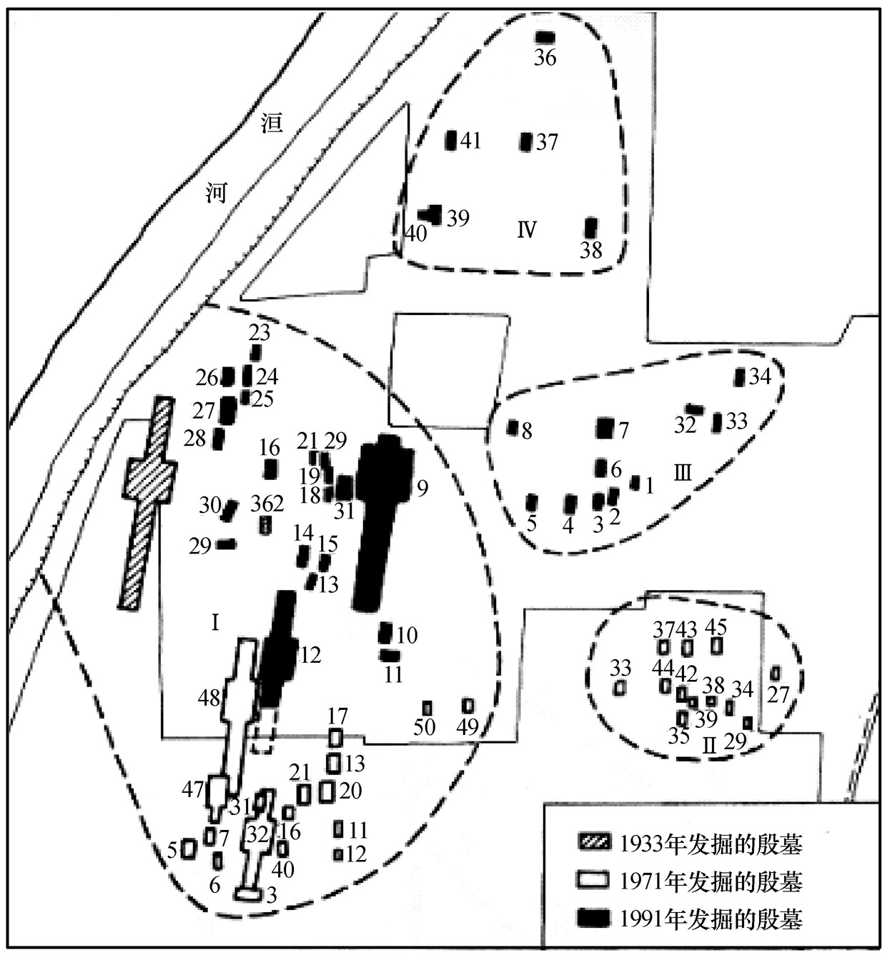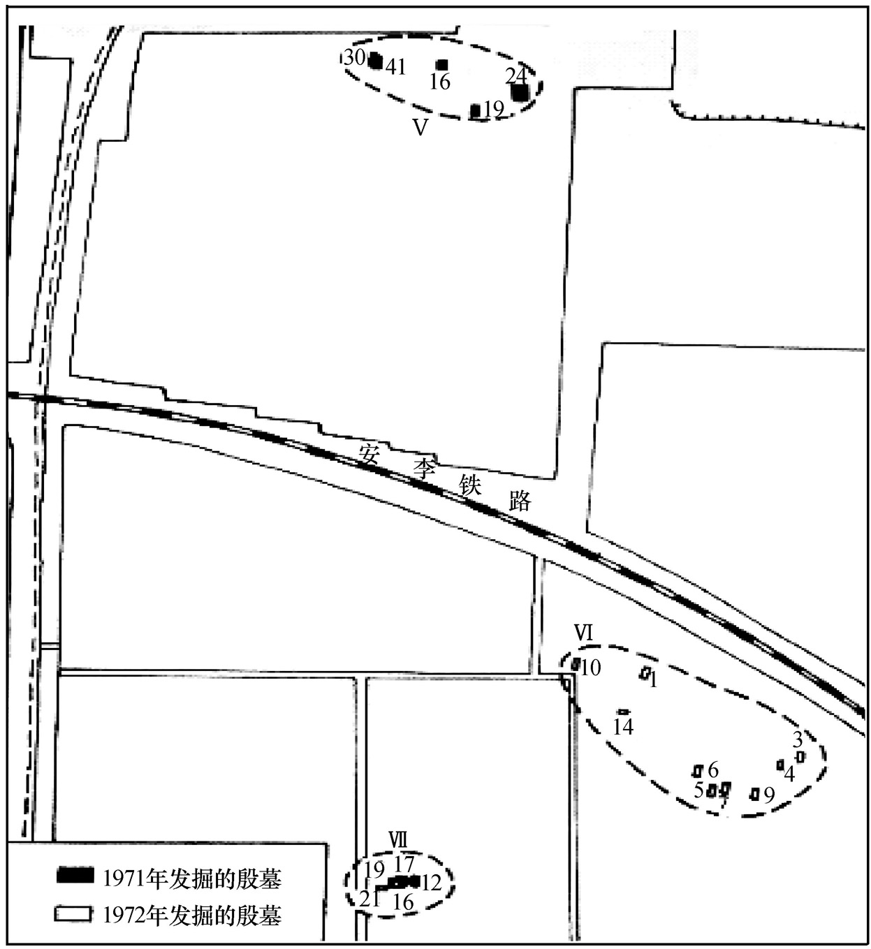 图一 后冈殷墓分组示意图(I—Ⅷ,第1组—第8组)