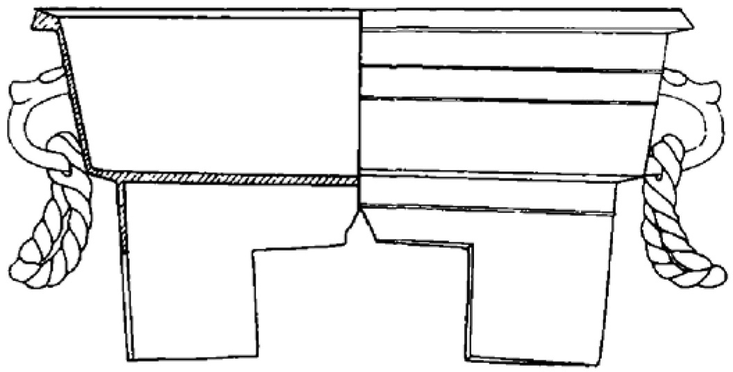 4.还有的器物造型新颖,是极稀见的器形。如1件方卢形器(M160:50),口呈长方形,浅腹,平底,高圈足,腹部短边两侧有一对兽头环耳,与一绹索形环状把手相套合(图八)。它与《西清古鉴》卷三十一的冰