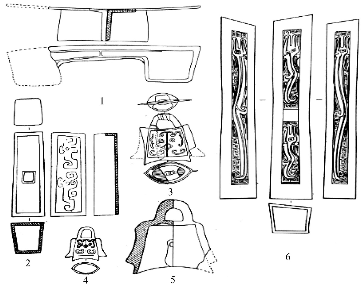 1.軓饰(后冈1933年大墓);2.方杆头(后冈1933年大墓);3.铃(后冈1933年大墓);4.铃(西区M823:1);5.铃(白家坟东北PM3:6);6.方杆头(郭家庄87AGNM52:14)