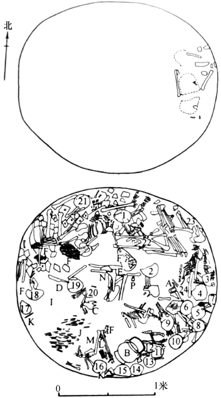 上:第1具人骨架出土位置;下:1—24.第2具—第25具人骨架出土位置 A.铜鼎,B.铜卣,C.铜戈,D.铜刀,E.铜戈,F.贝,I.谷粒,J.成束的丝麻,K.骨笄,L.铜泡,M.铜璜形器,N.象牙棒