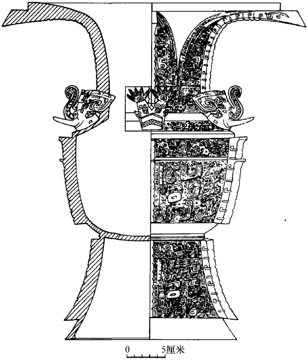 。在这里应当指出的是,1965—1966年发掘的山东益都苏埠屯1号大墓,其墓室面积达160平方米,有4条墓道,但该墓被盗严重,无完整的铜礼器。在墓中出土的铜器残片中,有1件兽头饰(1:10),兽头的顶部向上伸出一对大角,角端伸出五个枝杈如手掌状,兽头高5.6厘米。原简报作者认为它与《殷周青铜器通论》图版玖拾的凤纹卣上的饰件相似,所以应是铜卣上的饰件。