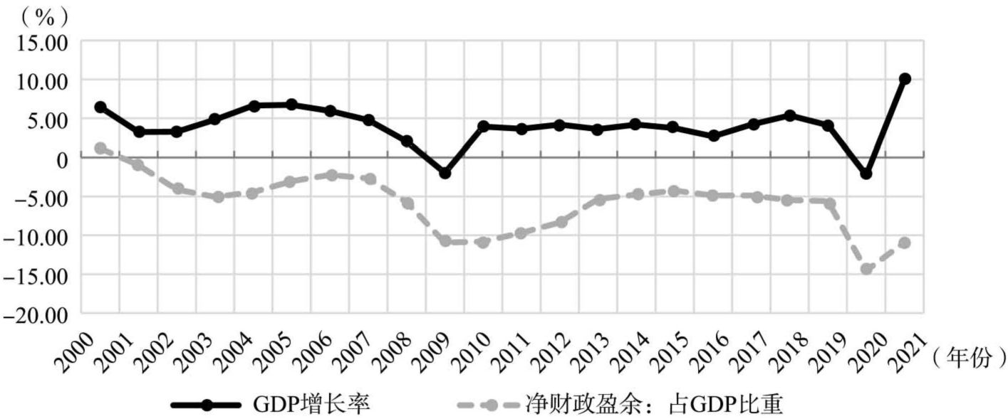 奥巴马第一任期内所面临的突出问题是,次贷危机背景下美国经济的严重衰退,其出台的财政政策避免了美国经济陷入更加糟糕的局面,但也导致了赤字的扩大(详见图2-2)。在美国次贷危机全面爆发的背景下,《2009年美国复苏与再投资法案》为支撑美国经济总需求以创造就业岗位和稳定经济做出了贡献,但在牵线搭桥以帮助经济进入可持续复苏的轨道方面有所欠缺。法案中大部分资金用于弥补家庭和政府的收入损失,且家庭财富的减少进一步削弱了财政扩张对消费的刺激作用,总体上,用于投入经济以拉动经济发展的净支出不足。奥巴马政府在推动医保范围扩大方面也做出了巨大贡献,但由于医疗补贴政策的不完善,该政策推动了美国赤字进一步扩大。