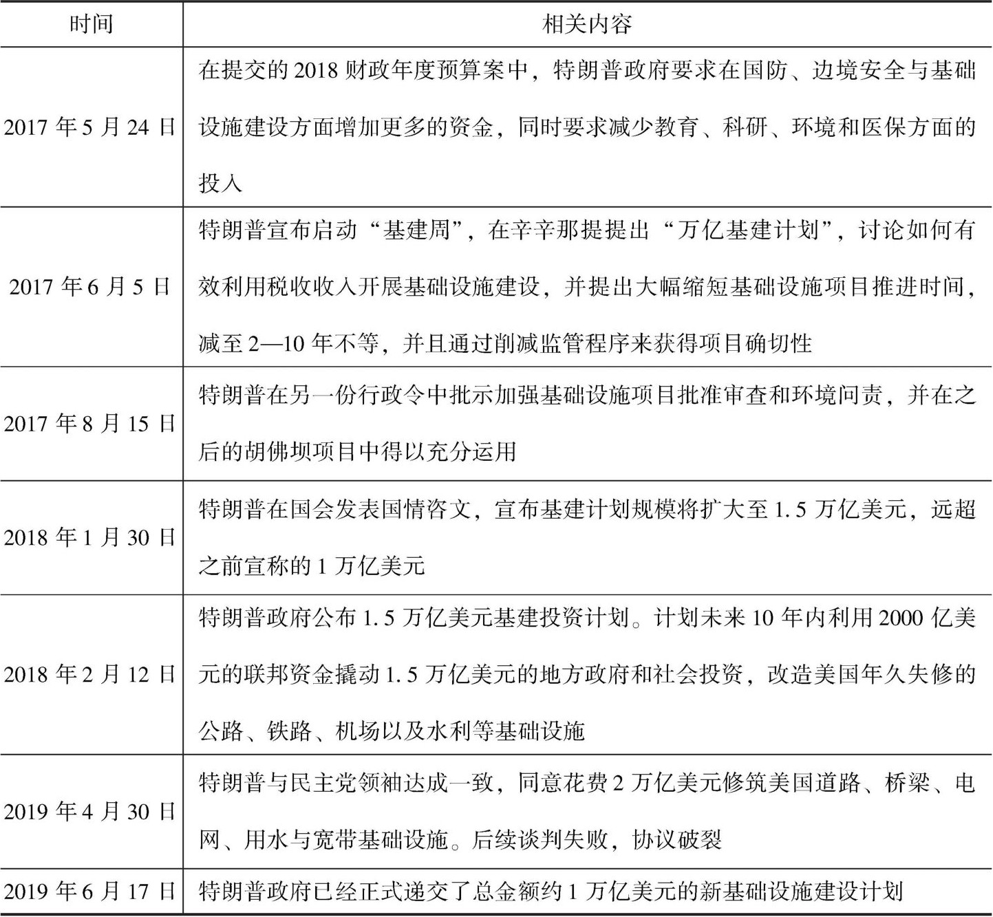 在2016年美国总统大选中,特朗普多次提及美国基础设施老旧落后,强调加强基础设施建设的重要性,提出要对美国的基础设施更新换代、提高美国人的生活质量。距离上一次美国大规模建设基础设施已经过了接近60年,虽然美国人口已经翻倍,科技飞速发展,但是一直没有对基础设施进行改进。美国土木工程师协会发布的国家基础设施状况“成绩卡”,给美国基础设施打分连年是D+,即“大多数情况下低于标准”。