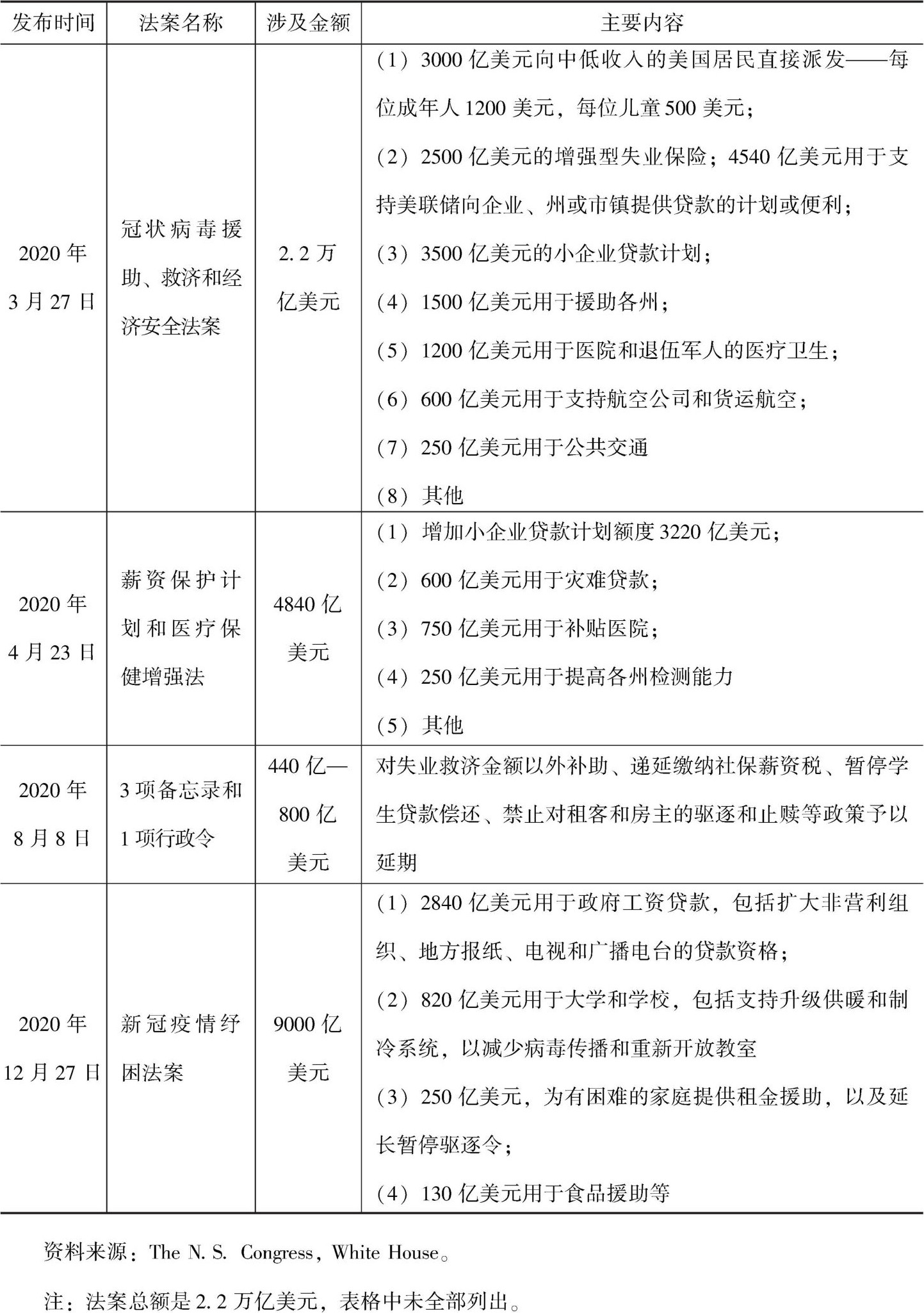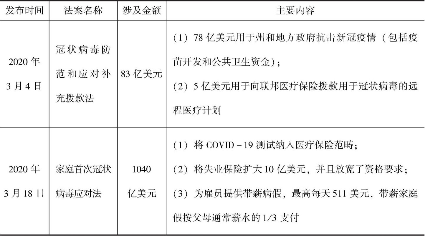 2020年3月4日,美国众议院引入《冠状病毒防范和应对补充拨款法》( The Coronavirus Preparedness and Response Supplemental Appropriations Act ),该法案在众议院获得通过,且民主党派在众议院将国会最初计划的25亿美元扩涨至83亿美元,随后,该法案在参议院获得通过。2020年3月18日,《家庭首次冠状病毒应对法》( The Families First Coronavirus Response Act )获得参议院通过,该法案侧重于补贴新冠疫情大流行对工人带来的经济损失。2020年3月27日,众议院以在线表决方式通过《冠状病毒援助、救济和经济安全法案》( The Coronavirus Aid,Relief and Economic Security Act ),同日,总统签署该法案生效。2020年4月23日,特朗普签署《薪资保护计划和医疗保健增强法》( The Paycheck Protection Program and Health Care Enhancement Act ),该法案没有设立新的支出项目,多数资金用于补充PPP额度,其余则用于公共卫生支出。此后,由于美国两党一直未能就新一轮刺激法案达成协议,而前期的部分政策项目已经到期,相关群体面临严峻的财务危机。因此特朗普动用其总统权力,在2020年8月8日签署了3项备忘录和1项行政令,对一些政策予以延期。