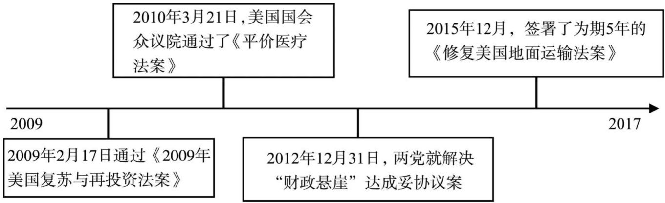 还有一个需要关注的问题是,财政政策除对经济产生影响外,还会对自身的运行产生影响。奥巴马任期的大部分财政年度,美国财政赤字持续扩张,如何应对财政政策带来的债务压力,也是本章重点关注的问题之一。奥巴马政府时期主要财政政策梳理如图2-1所示。