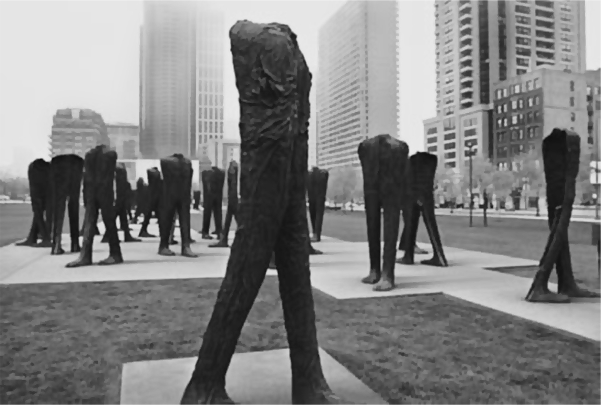 最近将可被称为“新大众”的整个图像凝结入一个单一的格式塔的艺术作品是波兰雕塑家玛格达莱纳·阿巴卡诺维奇(Magdalena Abakanowicz)的一件杰出的雕塑装置。顾名思义,2007年被安装在芝加哥格兰特公园里的《集会》( Agora )使人想起希腊人关于公共集会场所的概念,无论是作为一个集市还是作为一个政治空间。但是阿巴卡诺维奇以几种重要的方式改变了人群的经典形象。首先,最明显的是,所有的形象(在规模上是壮观的,大约9英尺高)都是无头的。其次,甚至更令人不安的是,他们全都是中空的,被切除了内脏,好像他们所有的内脏都已被收割,仅留半身,背部敞开,前面的躯壳包括手臂、腿部,被减少到仅是会覆盖他们身体的衣服的躯干,以及表示他们动作的手和脚,仿佛他们的皮肤和骨骼也已被收割。最后,110个形象的组合看起来明显是随机化的。虽然每个形象似乎都正在有目标地朝一个或另一个方向大步走,但是他们当中没有人一起走,或相遇,或流露出任何合并成组或甚至成双的身体信号。从这个意义上来说,他们与作为组织成紧密纪律模式的大众装饰的人群图像恰恰相反。他们给观者的印象是可能正在聚集或分散过程中的人群,也许除了一个微妙的指征之外,没有任何明显的形状或一致性。他们似乎分成两个集群,一群比另一群更大,他们之间有几个形象排列成行,仿佛在为两个无组织的组合扮演“中间人”的角色。也许这反映了社会组织最原始的形式,即划分为朋友与敌人,我们与他们。无论如何,在个人身体和集体组装两个层面上,他们剪切成一个双重无头的形象,该形象正如我母亲过去经常所说的“像被砍掉了头的鸡”一样漫无目的地四处转悠(参见图10)。