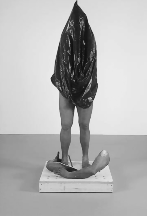 那么克隆体的问题不仅在于它是一个生物的活态图像,而且在于它是不能分辨的、匿名的,受控于一种无个性或冷漠性,这种特征走向其最激进的表现形式是无头的克隆体,即一种没有头颅、没有思想、没有灵魂的生物,它是沦落为“赤裸生命”(bare life)的人类有机体的例证。艺术家保罗·麦卡锡(Paul McCarthy)令人不安的雕塑作品《克隆体》( The Clone )或许最佳地表现了作为一个独特形象的克隆体图像,该雕塑是一个像人体模型的人类躯体,它的头部和躯干被一个垃圾袋罩住,它被拆离的双臂平躺于它双脚边的地上(参见图8)。
