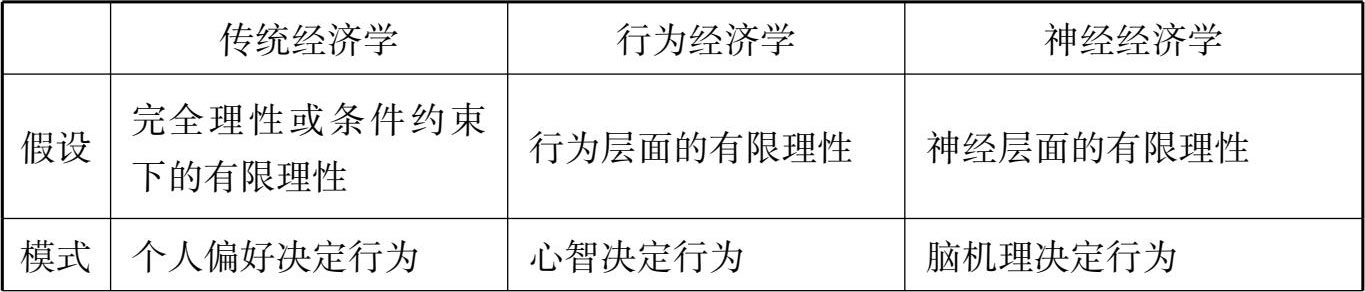 神经经济学与传统经济学、行为经济学的区别与联系如表 0-1所示。