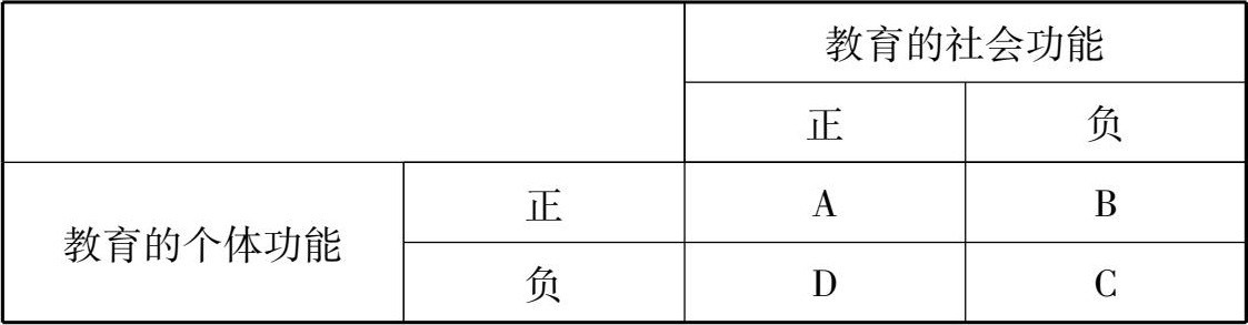 表中A、B、C、D的意义分别是:A:教育对社会和个体发展均为正向功能;B:教育对社会发展为负向功能而对个体发展为正向功能;C:教育对社会和个体发展均为负向功能;D:教育对社会发展为正向功能而对个体发展为负向功能。