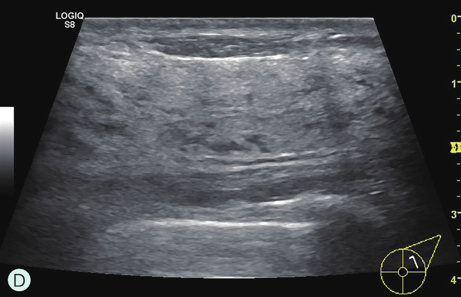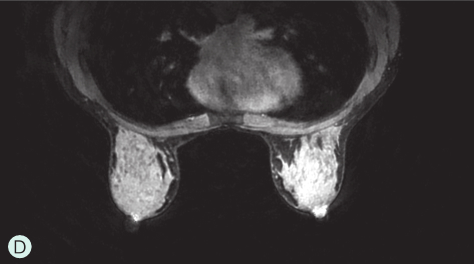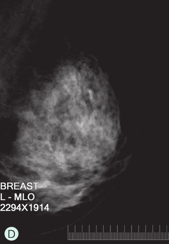 D级:极度致密型(降低乳腺钼靶摄影的敏感性)(图1-3-1D、图1-3-2D、图1-3-3D)。
