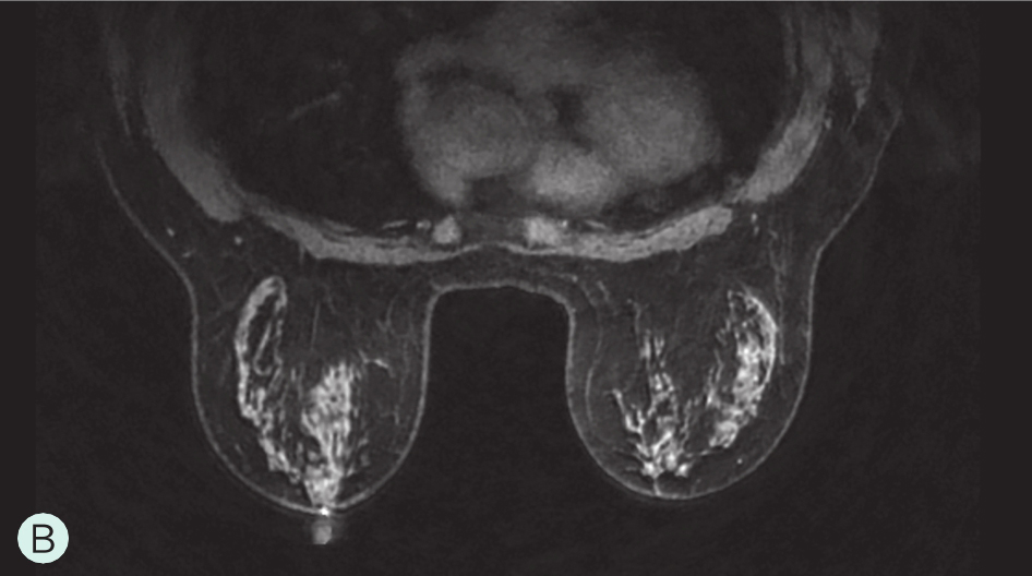 B级:散在纤维腺体致密型(图1-3-1B、图1-3-2B、图1-3-3B)。