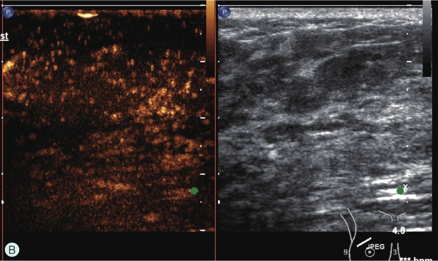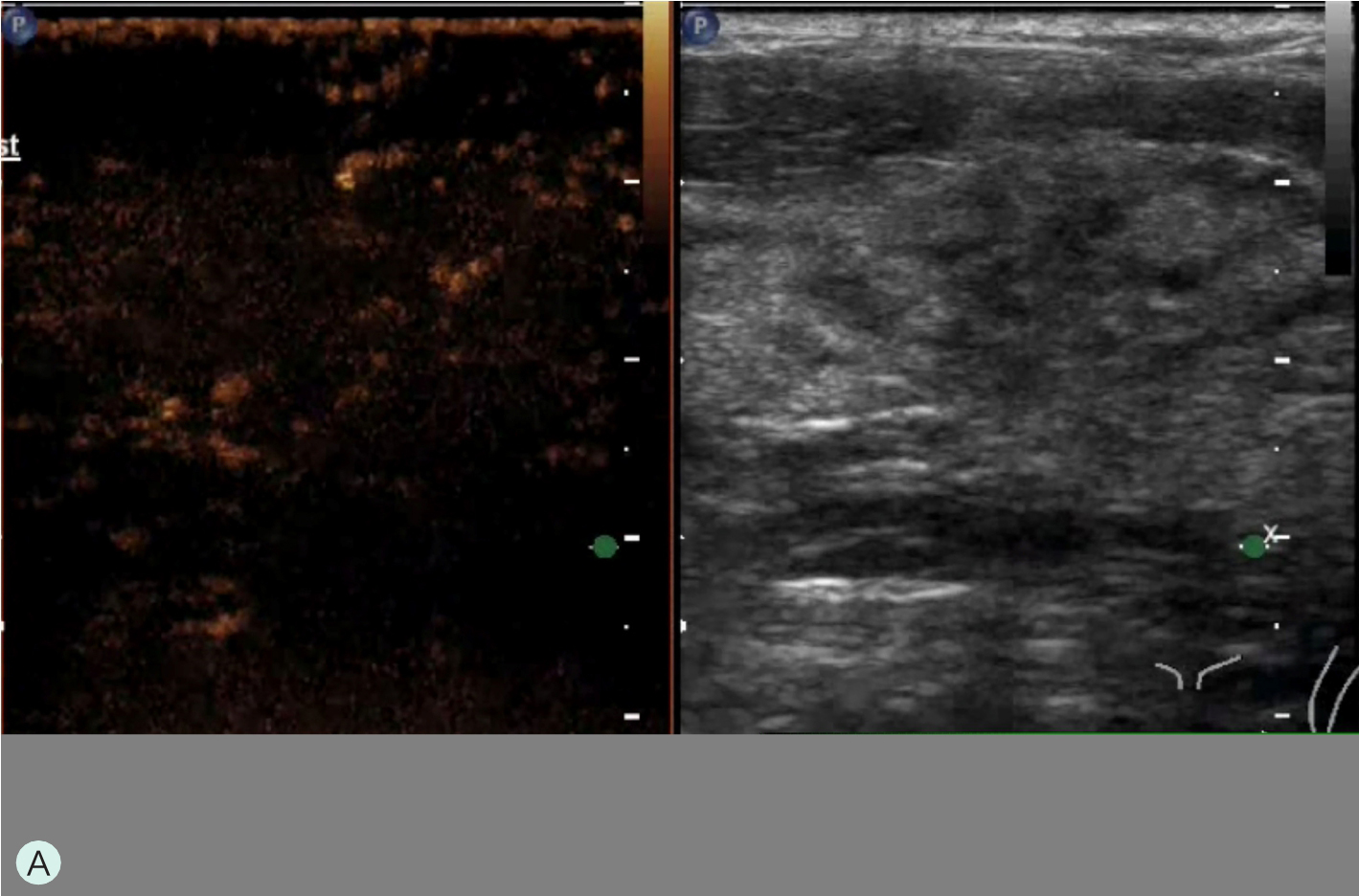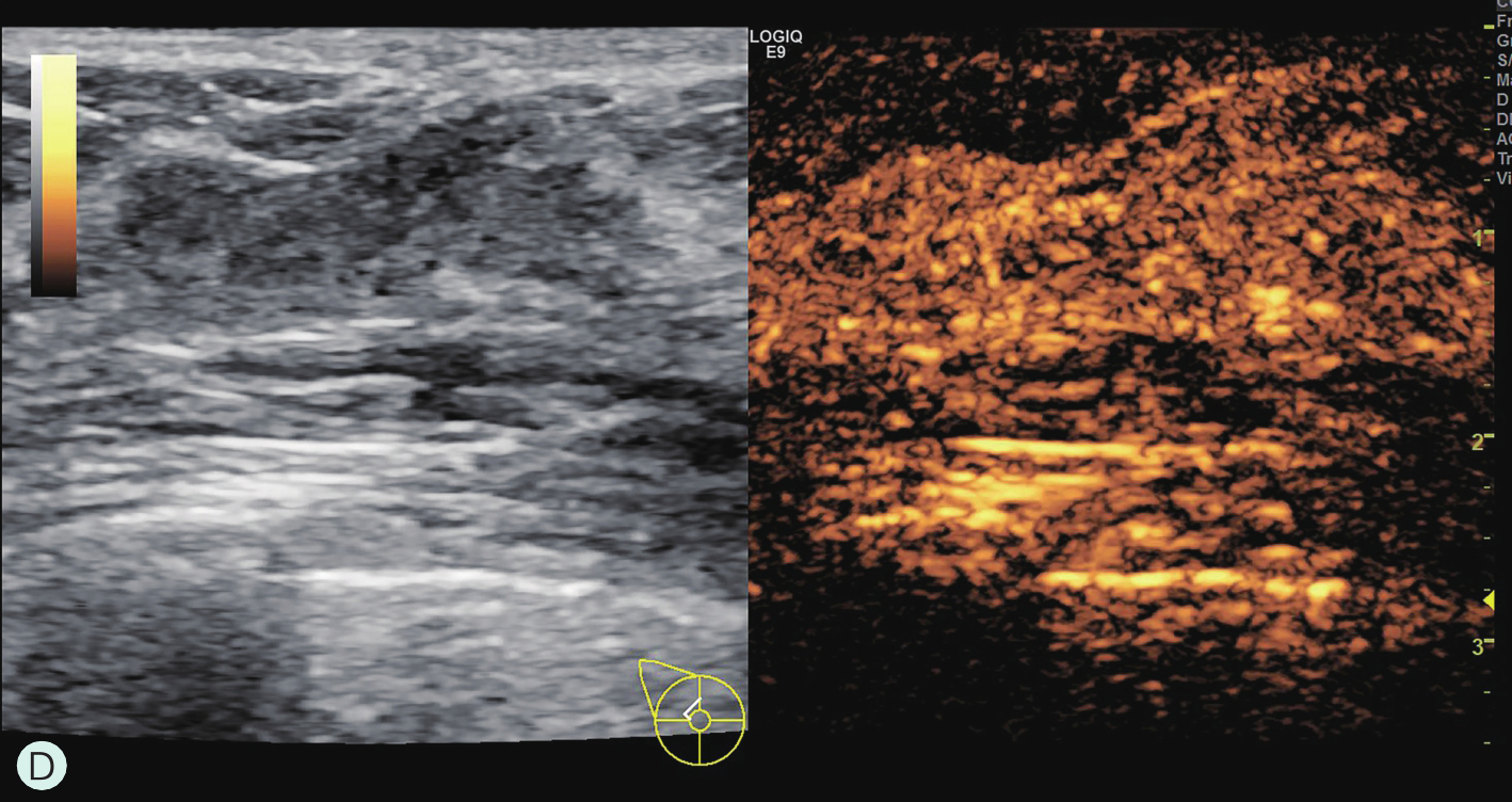 对于绝经后对乳腺超声造影的影响程度目前尚不清楚。但有乳腺MRI研究报道,绝经后乳腺癌患者更常表现为初期缓慢造影剂摄取和延迟扫描持续强化,而不是典型的早期快速造影剂摄取和延迟MR序列上的廓清。依笔者经验认为,乳腺超声造影更多地关注早期动脉相表现来进行判读和诊断,对延迟相关注不多,其诊断价值有限,且超声造影剂在乳腺内的存留时间明显短于乳腺MRI上钆造影剂的存留时间。就目前绝经后患者乳腺超声造影研究和笔者自身经验来看,绝经状态对超声造影动脉相表现没有明显影响,对于乳腺癌大多表现为早期快进高增强,与MRI所反映的初期缓慢造影剂摄取并不一致。