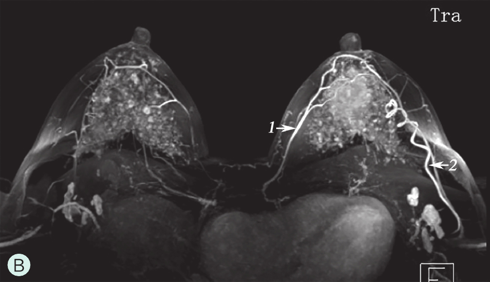 A.乳腺血供示意图;B.乳腺增强MRI造影血管图;C.乳腺增强MRI三维重建血管图;D.乳腺血管铸型解剖标本