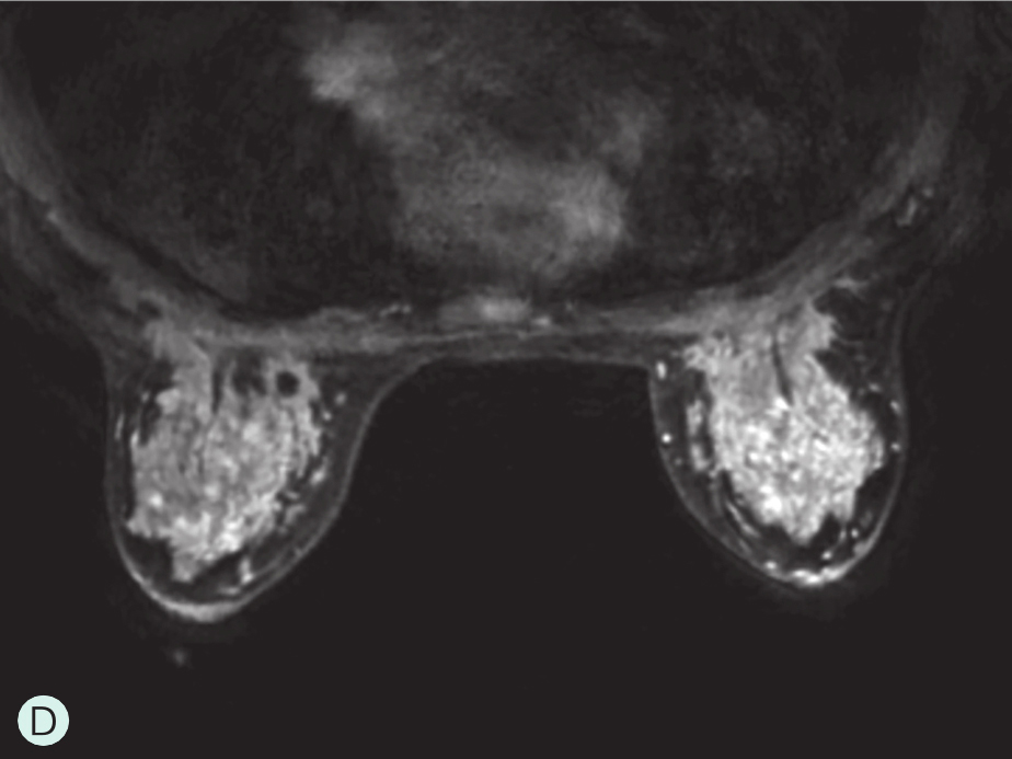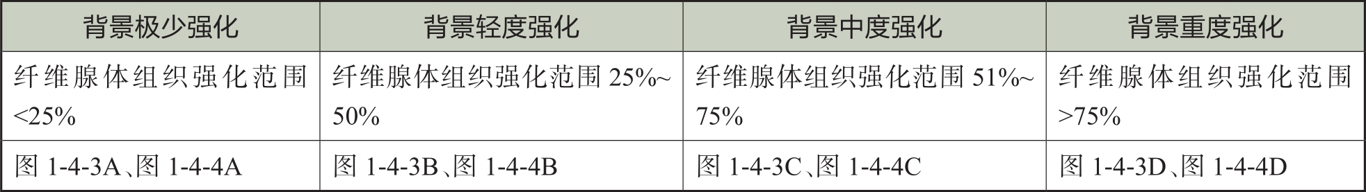另外,对于不同女性或同一女性不同乳腺、不同生理状态下,其乳腺的微血管及微灌注也不尽相同。故背景实质强化是所有增强乳腺影像学都必须关注的问题(表1-4-1)。背景强化指注射造影剂后正常纤维腺体组织的强化程度,而乳腺密度与造影剂无关。背景实质强化可能与将来发生浸润性乳腺癌的风险有关。一项多中心研究纳入了4247例女性,中位随访时间2.8年,其中176例出现了乳腺原位癌或浸润性乳腺癌,轻度、中度和显著背景实质强化均与乳腺癌风险增加有关,风险比(hazard ratio,HR)分别为1.8(95% CI =1.1~2.90)、2.4(95% CI =1.5~3.9)和3.4(95% CI =2.1~5.7)。在浸润性乳腺癌亚组中,合并轻度、中度和显著背景实质强化也与乳腺癌风险增加有关(HR 2.7,95% CI =1.7~4.5)。与背景实质强化程度增加有关的未来发生浸润性乳腺癌的风险和乳腺密度无关。