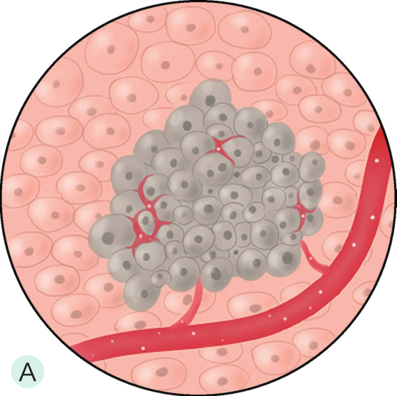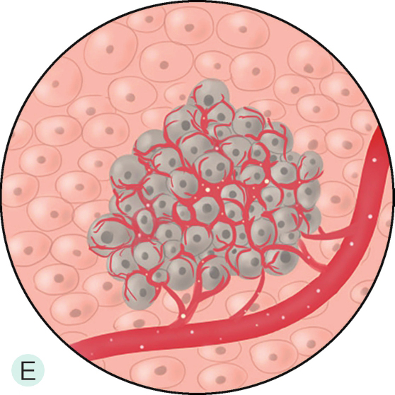 增强乳腺影像学,包括增强磁共振、超声造影、增强乳腺X线都是基于肿瘤血管生成或新生血管的观念。肿瘤相关血管数量与通透性增加,血流动力学改变,能够快速摄入和释放造影剂,可帮助鉴别乳腺癌与乳腺良性病变。研究显示,从正常乳腺腺体逐渐发展为乳腺普通型导管上皮增生症(usual ductal hyperplasia,UDH)、导管上皮非典型增生(atypical ductal hyperplasia,ADH)、导管原位癌(ductal carcinoma in situ,DCIS)、浸润性导管癌(invasive ductal carcinoma,IDC)的过程中,刺激新生血管生成的血管内皮细胞生长因子(vascular endothelial growth factor,VEGF)表达水平及组织病灶的微血管密度不断增加(图1-4-2)。