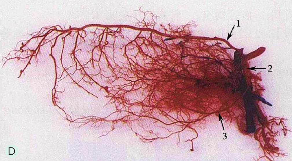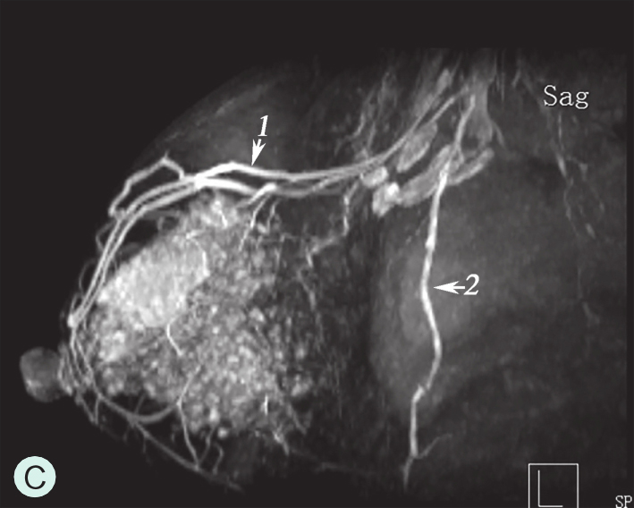 乳腺主要由胸廓内动脉、胸外侧动脉及肋间穿支动脉供血(图1-4-1A~图1-4-1C)。胸廓内动脉发自锁骨下动脉,在相应肋间胸骨旁发出分支穿过胸大肌,主要供应乳房的内侧部分血供;胸外侧动脉发自腋动脉第2段,穿过腋静脉深面,经腋窝沿胸小肌下缘走行,负责胸大肌、胸小肌、前锯肌及乳房外侧部分血供;另外,第3~5肋间动脉从各相应的肋间穿出,与胸外侧动脉及胸廓内动脉分支吻合,供应乳房下部分血供。上述三组主要动脉在乳房内又不断分支并相互吻合形成血管网,且走行自然连续,但缺乏类似于肝脏及肾脏有规律的血管分支树结构,同一女性双侧乳房或不同女性间都不相同,无固定分支规律可循(图1-4-1D)。