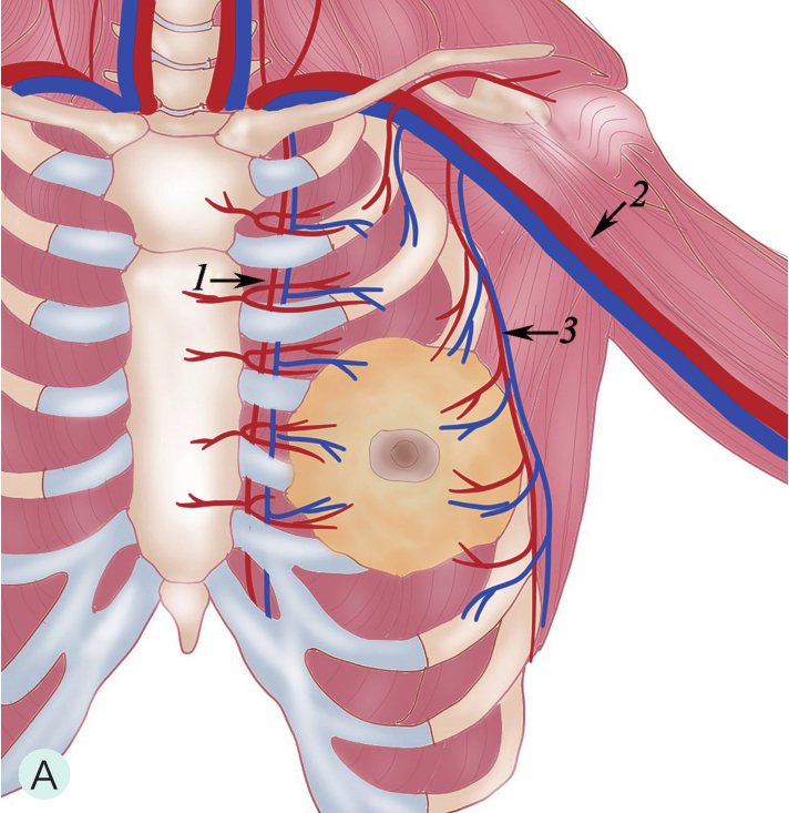 1.胸廓内动脉;2.腋动脉;3.胸外侧动脉