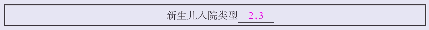 某出生20天的新生儿患者为早产儿(胎龄30周),因发热入院,确诊为“新生儿肺炎、先天性室间隔缺损”。同时满足早产儿及有疾病新生儿两项,应以半角逗号隔开,依次填写,故新生儿入院类型处应填写“2,3”(图1-32)。