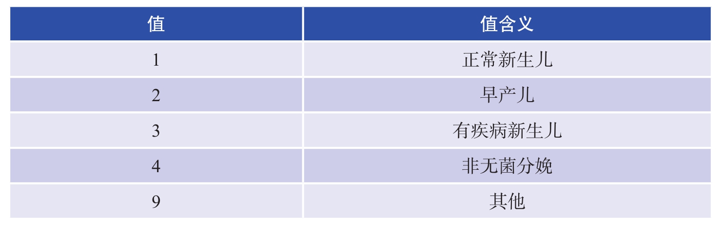 “新生儿入院类型”指与新生儿入院相关的影响因素,根据新生儿出生时的情况可分为正常新生儿、早产儿、有疾病新生儿、非无菌分娩和其他五种情形。