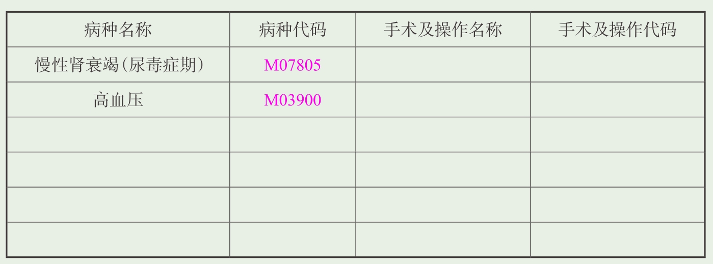 某定点医疗机构的一位门诊就诊患者同时患有慢性肾衰竭(尿毒症期)、高血压和糖尿病。根据当地门诊慢特病医保政策,慢性肾衰竭(尿毒症期)、高血压与糖尿病都属于门诊慢特病病种。患者本次门诊的主要目的是进行血液透析治疗与购买降压药,糖尿病没有产生医疗成本,故病种名称处应填写慢性肾衰竭(尿毒症期)与高血压。这两种疾病在《医保门诊慢特病病种》中对应的病种代码分别为M07805和M03900(图2-6)。