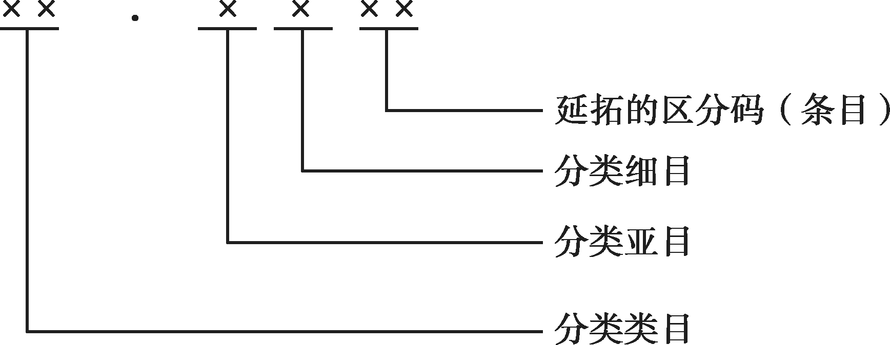 手术及操作代码共6位,由阿拉伯数字按特定顺序排列表示(图2-8)。其中,前2位为“分类类目”,代表手术章节;第3位为“分类亚目”,代表手术大类;第4位为“分类细目”,代表手术大类的细分;第5、6位为“延拓的区分码(条目)”,代表具体手术及操作名称。