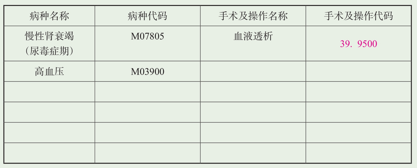 如某定点医疗机构的一位门诊就诊患者同时患有慢性肾衰竭(尿毒症期)、高血压和糖尿病。根据当地门诊慢特病医保政策,慢性肾衰竭(尿毒症期)、高血压与糖尿病都属于门诊慢特病病种。患者本次门诊的主要目的是进行血液透析治疗与购买降压药,糖尿病没有产生医疗成本,故手术及操作名称处应填写血液透析,血液透析在《医保手术操作分类与代码》中对应的手术及操作代码为39.9500(图2-9)。