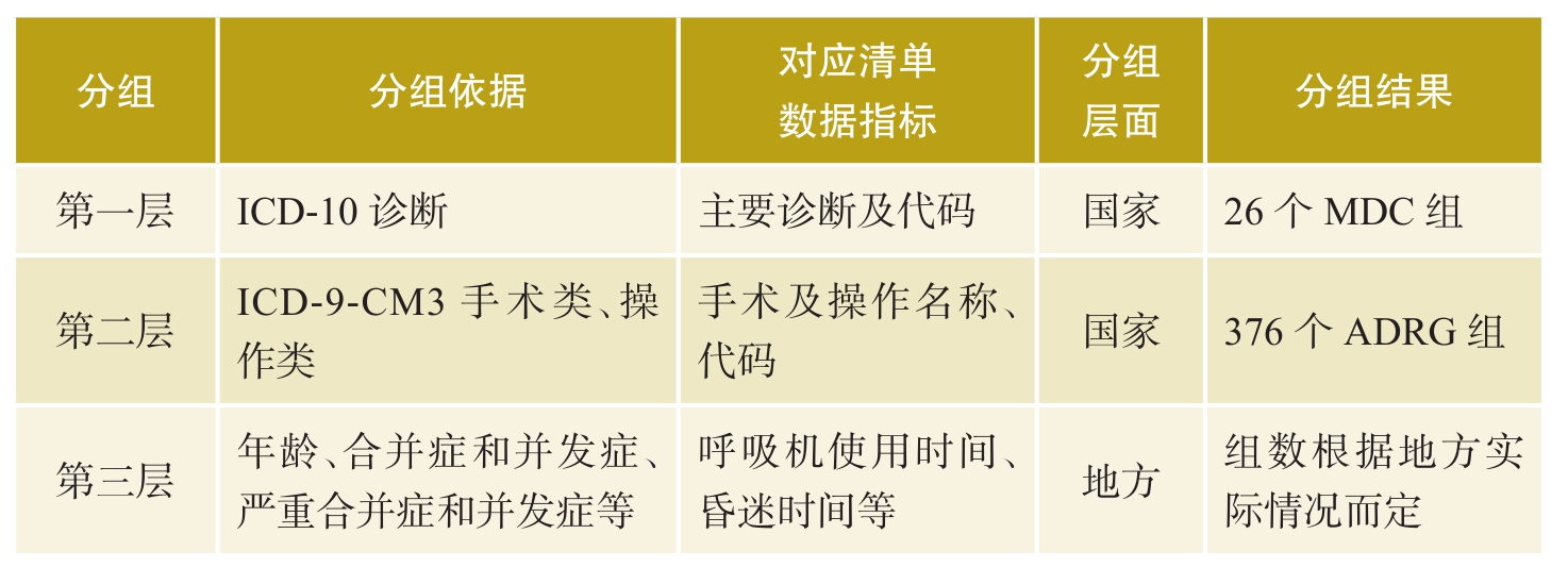 二是提供DRG/DIP付费分组数据。以DRG付费为例,我国国家医疗保障疾病诊断相关分组(CHS-DRG)数据通过医保结算清单从医疗机构采集,住院诊疗信息是DRG的重要决定因素。CHS-DRG共分为三层,每层分组的依据和所需要的主要数据指标均来源于医保结算清单中的住院诊疗信息(表3-1)。其中,前两层分组为国家统一分组方案,清单可为其提供“主要诊断及代码”“手术及操作名称、代码”等统一分组数据。第三层分组为地方分组,清单可为其提供“其他诊断”“呼吸机使用时间”“昏迷时间”等核心数据指标。