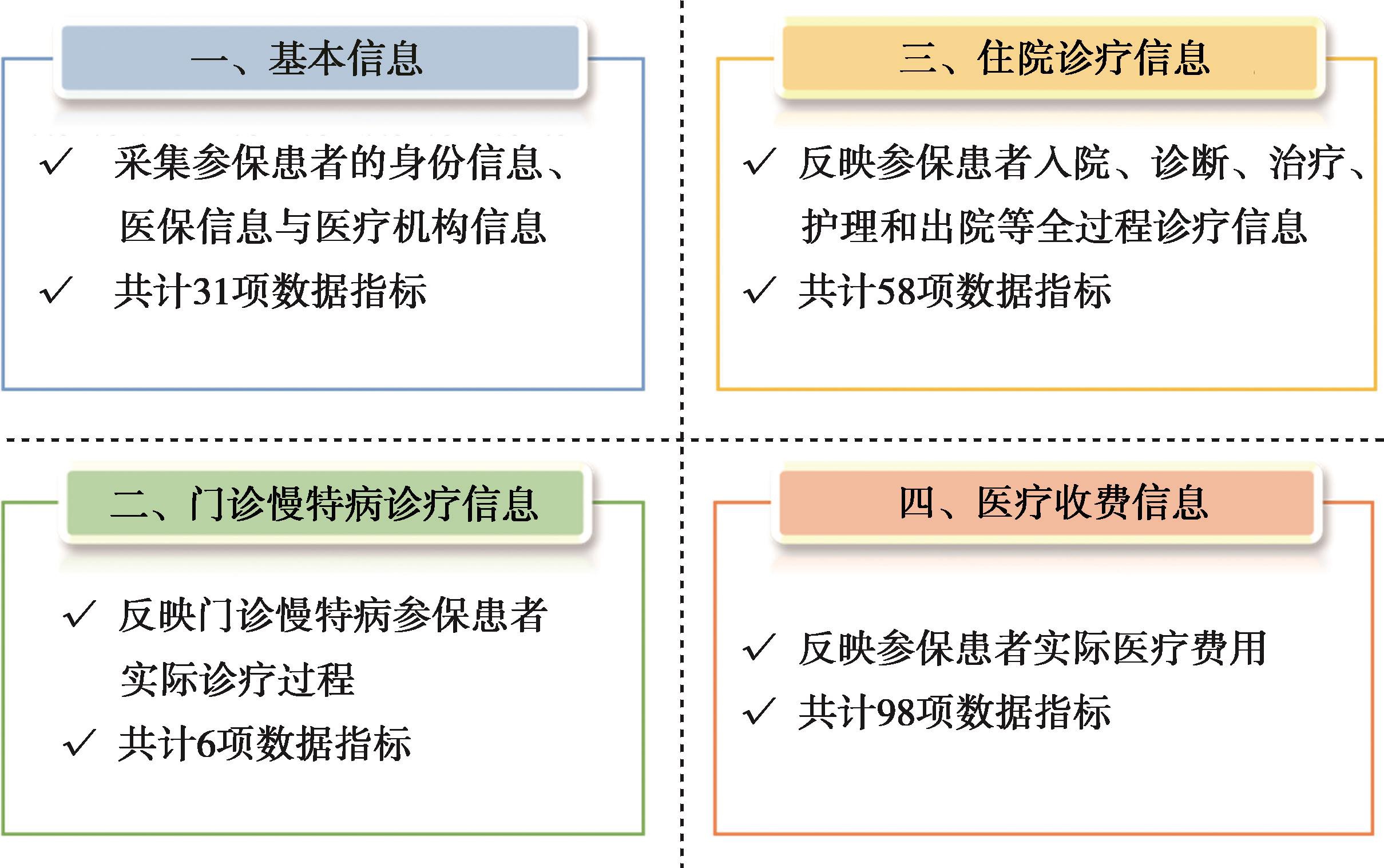 其中,基本信息采集参保患者与定点医疗机构的基础信息,包括参保患者的身份信息、医保信息及就诊定点医疗机构信息等,以便医保经办机构明确结算对象及报销政策;门诊慢特病诊疗信息反映门诊慢特病参保患者的实际诊疗过程,为常见门诊慢特病的分析提供数据基础;住院诊疗信息反映患者入院、诊断、治疗、护理、出院的全诊疗过程的信息,为DRG/DIP付费提供基础;医疗收费信息反映参保患者的实际医疗费用,为医保费用结算提供核查依据,有助于对医疗费用进行大数据分析。