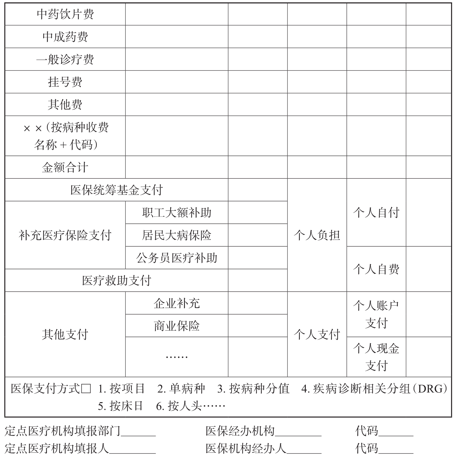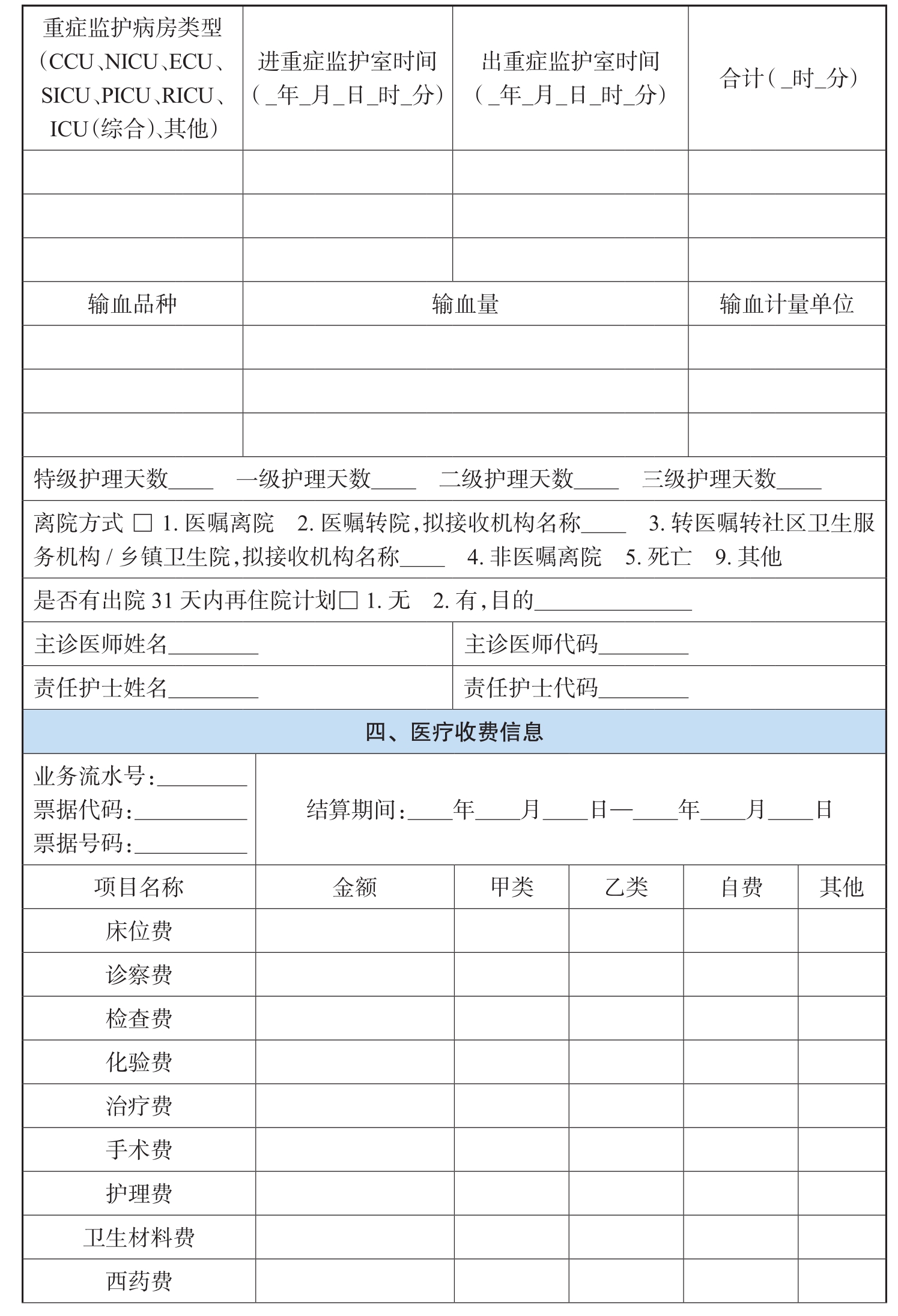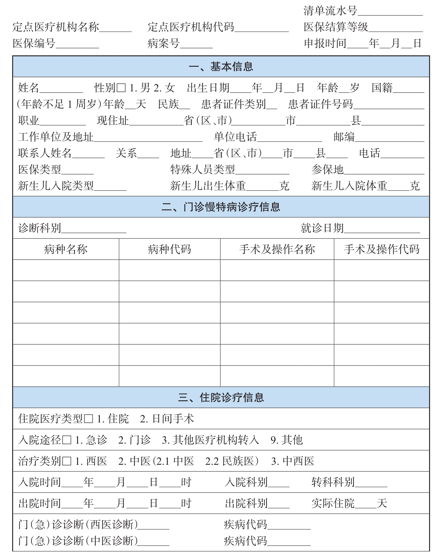 医保结算清单分为“基本信息”“门诊慢特病诊疗信息”“住院诊疗信息”与“医疗收费信息”四个模块(图Ⅲ),总计193项数据指标。