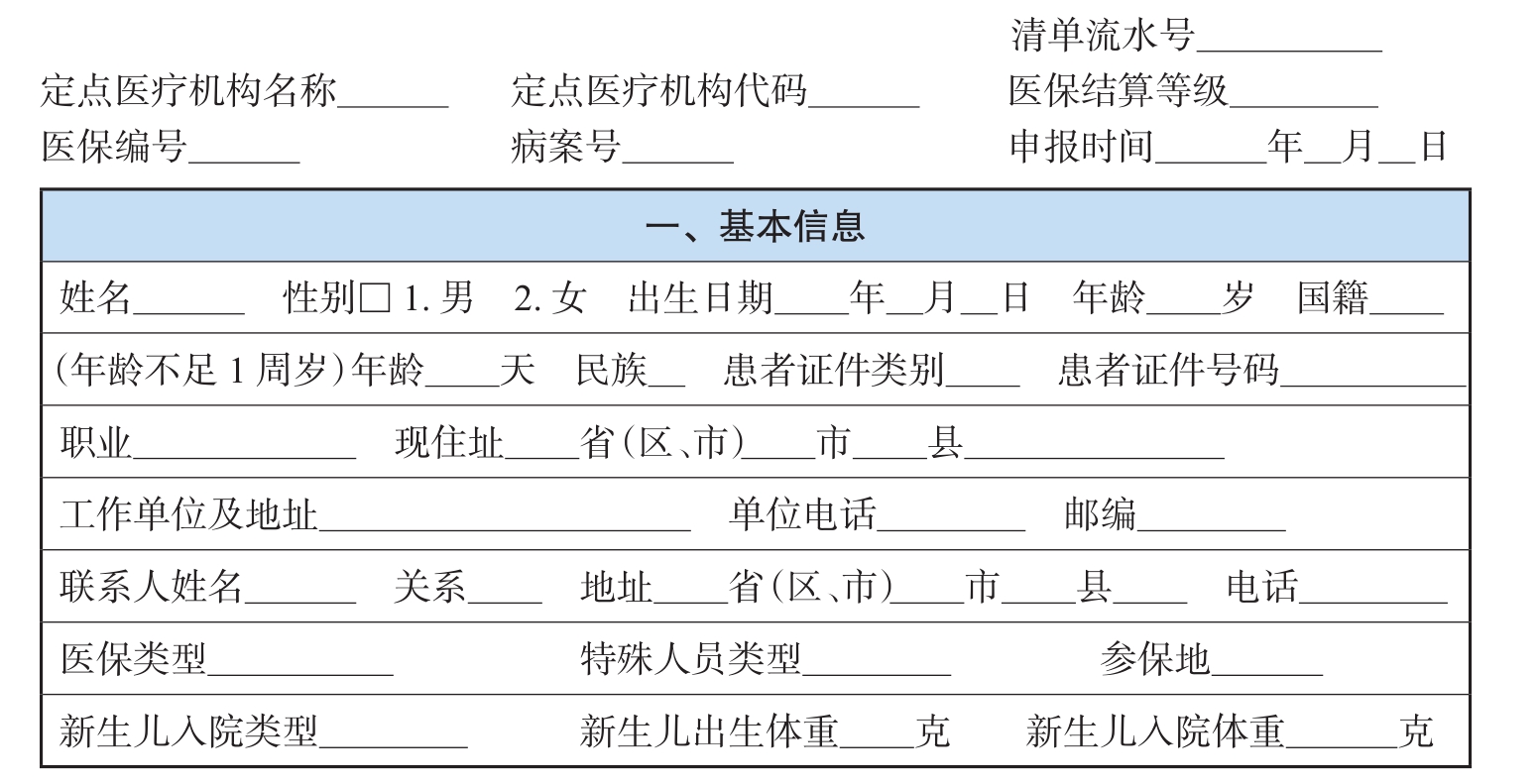 基本信息反映参保患者与定点医疗机构的基础信息,包括参保患者的身份信息、医保信息与就诊定点医疗机构信息。该模块主要以国家卫生健康委员会(简称“国家卫生健康委”)住院病案首页中的基本信息为蓝本,结合医保管理实际需求设计。本部分数据范围为0001~0031,共计31项数据指标。