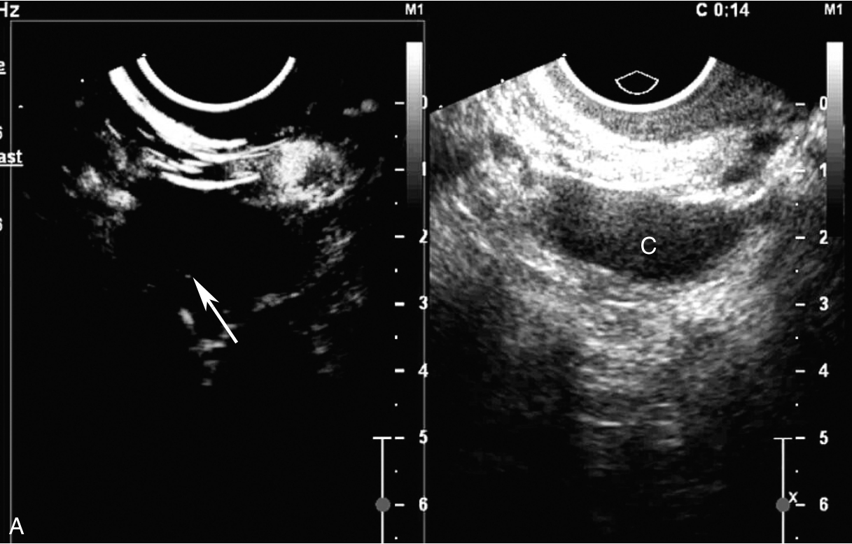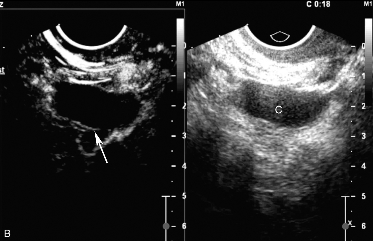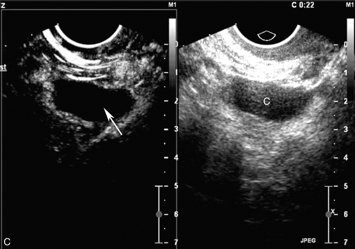 右卵巢上囊肿的经静脉超声造影见图3-12-4及ER 3-12-2。注入造影剂14s,囊肿囊壁开始出现增强(图3-12-4A箭头所示),晚于子宫肌层增强;注入造影剂后18s,囊壁呈较均匀等增强(图3-12-4B箭头所示);注入造影剂后22s,囊肿内始终未见造影剂进入(图3-12-4C箭头所示)。