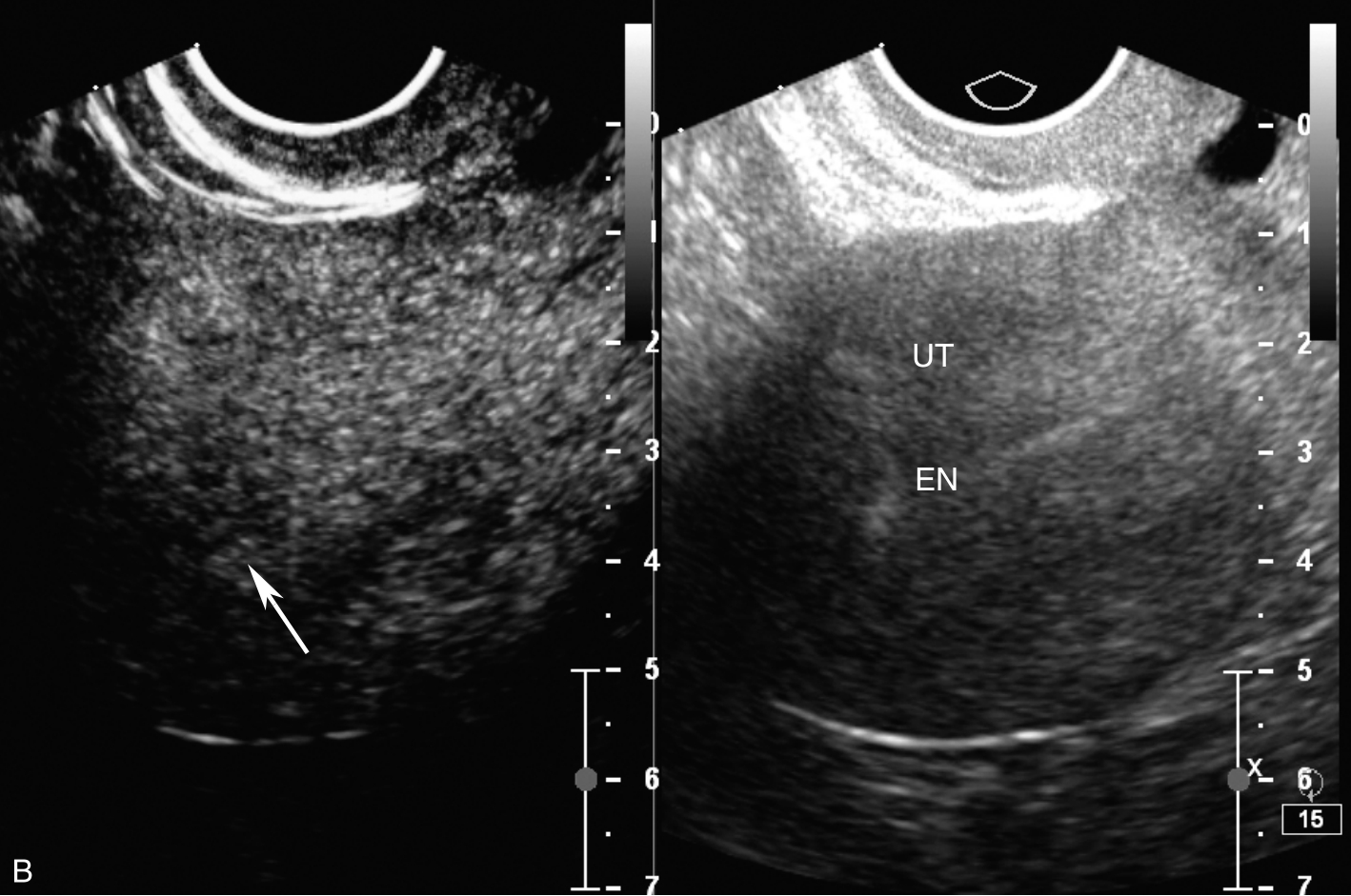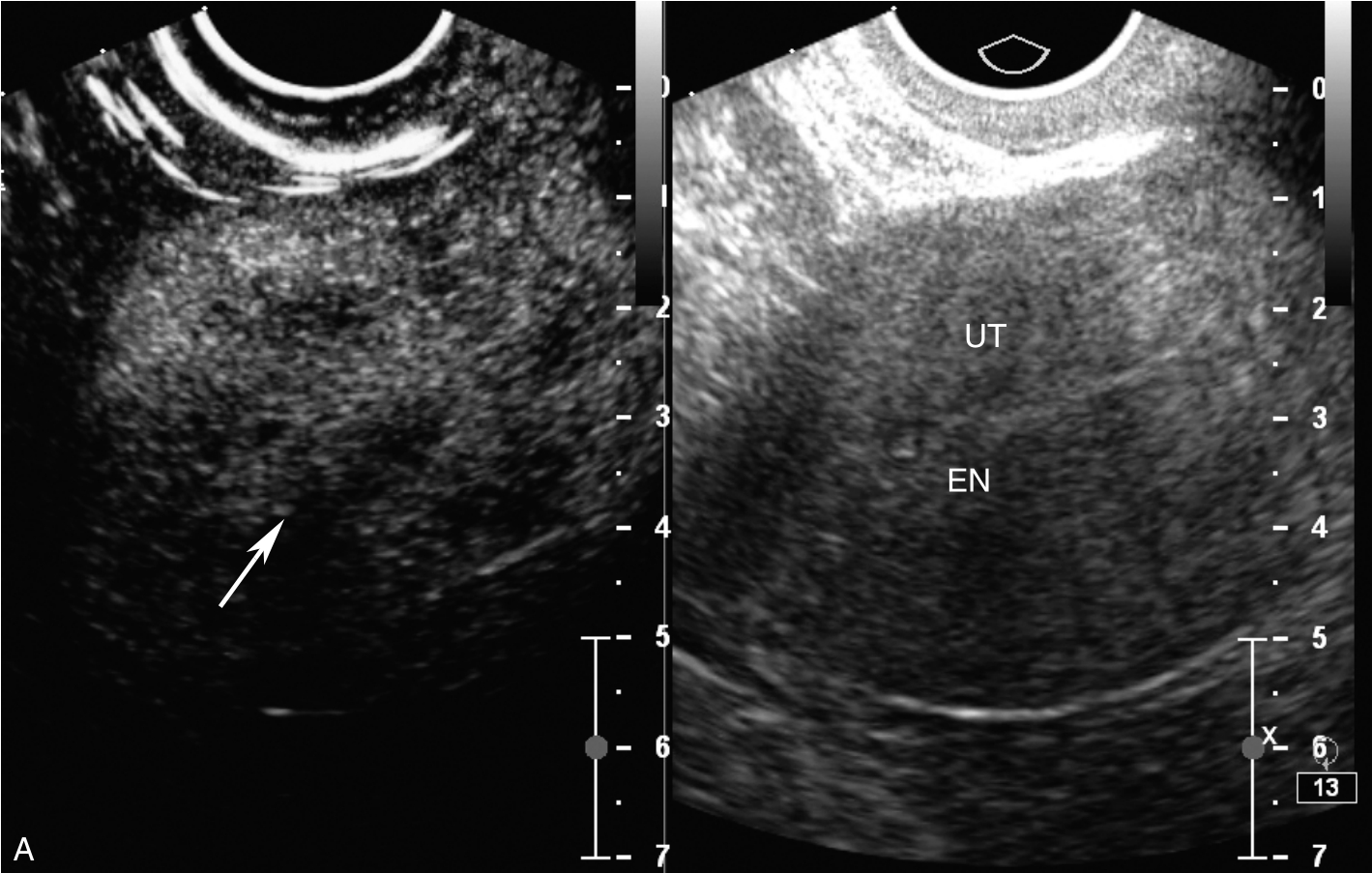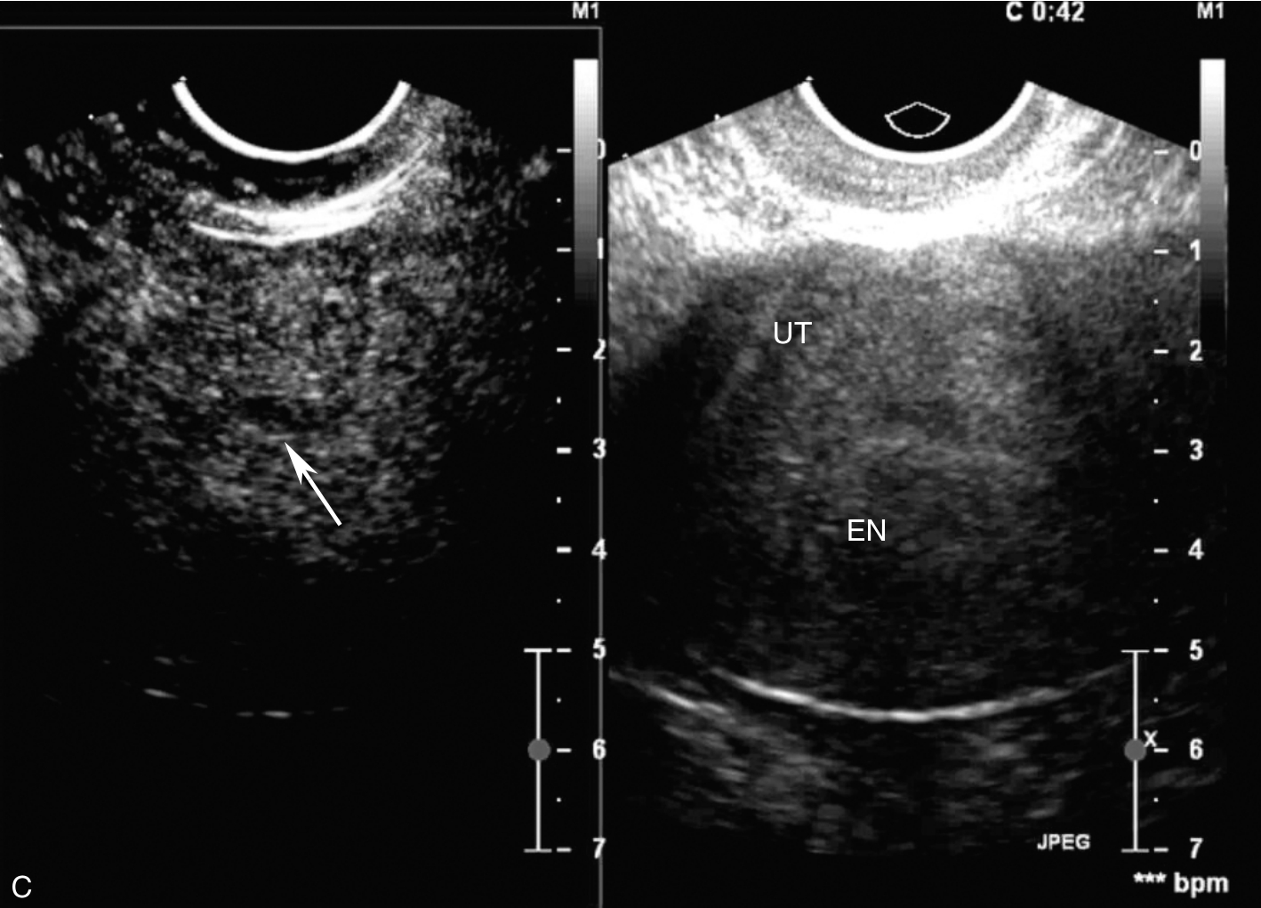 子宫经静脉超声造影见图3-12-3及ER 3-12-1。注入造影剂后16s,子宫内膜开始出现增强(图3-12-3A箭头所示),晚于子宫肌层增强;注入造影剂后23s,子宫内膜呈等增强,造影剂分布不均匀(图3-12-3B箭头所示),其周边出现造影低增强区;注入造影剂后42s,子宫肌层未见异常造影剂聚集(图3-12-3C箭头所示),子宫内膜消退与子宫肌层同步。