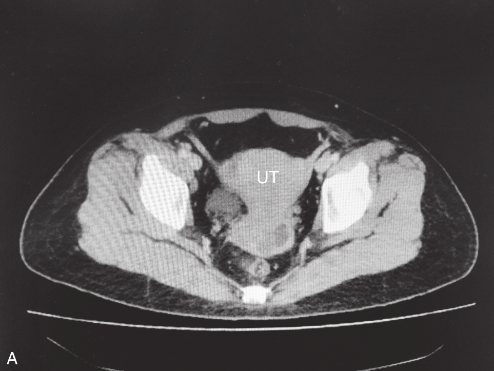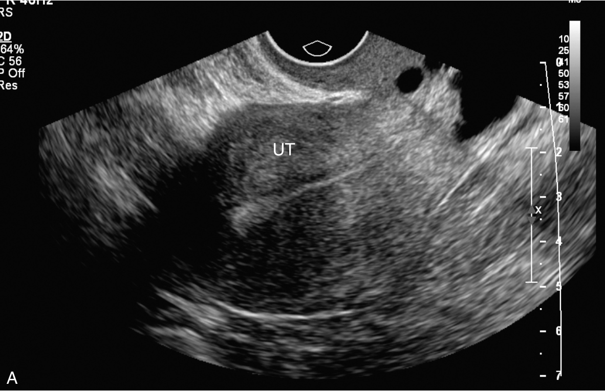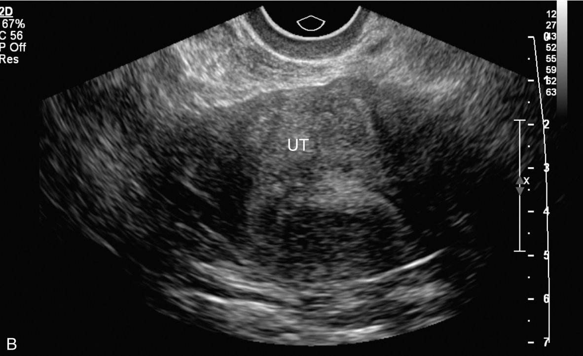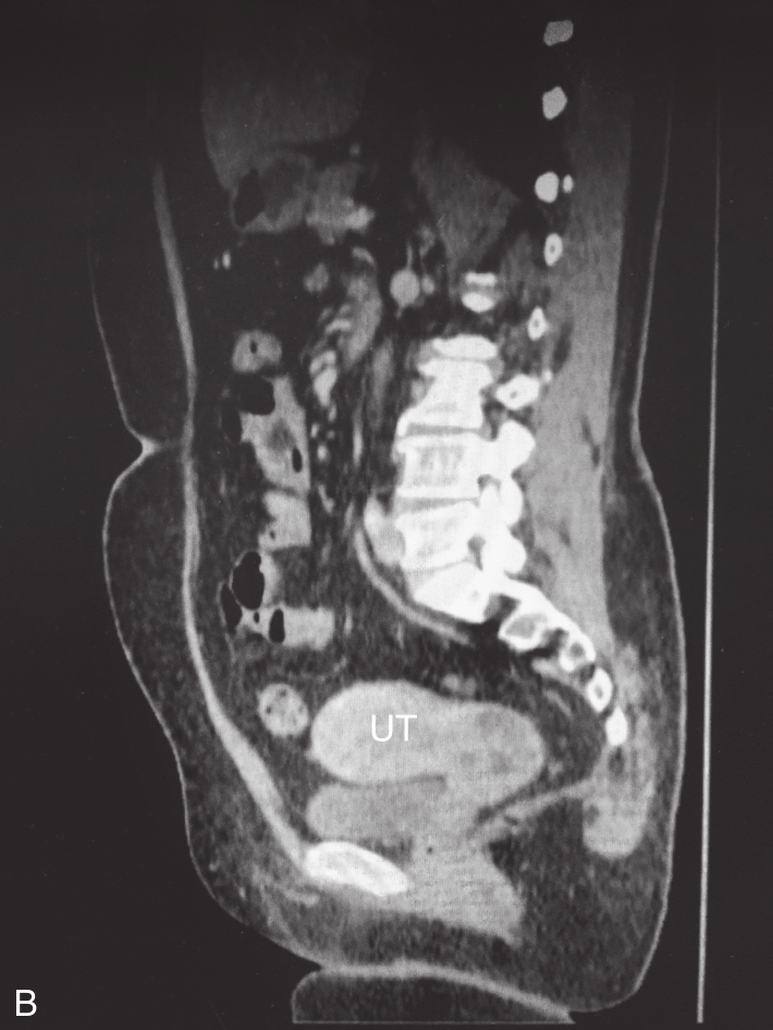 A.盆腔子宫底横切面;B.盆腹腔子宫矢状面。UT:子宫。