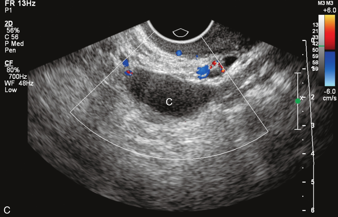 经阴道超声检查见图3-12-2。子宫前位,宫体大小为4.6cm×6.5cm×5.6cm,内膜居中,厚0.2cm(单层),肌壁回声欠均匀,未探及明显异常血流。宫颈查见囊性占位,最大径约3.1cm,液体欠清亮,周边未探及血流信号。右卵巢上查见囊性占位,大小为3.0cm×1.6cm×2.5cm,囊液欠清亮,囊壁可探及血流信号。左附件区未见占位。超声检查结果:右卵巢上囊性占位(多系良性),子宫颈腺囊肿。