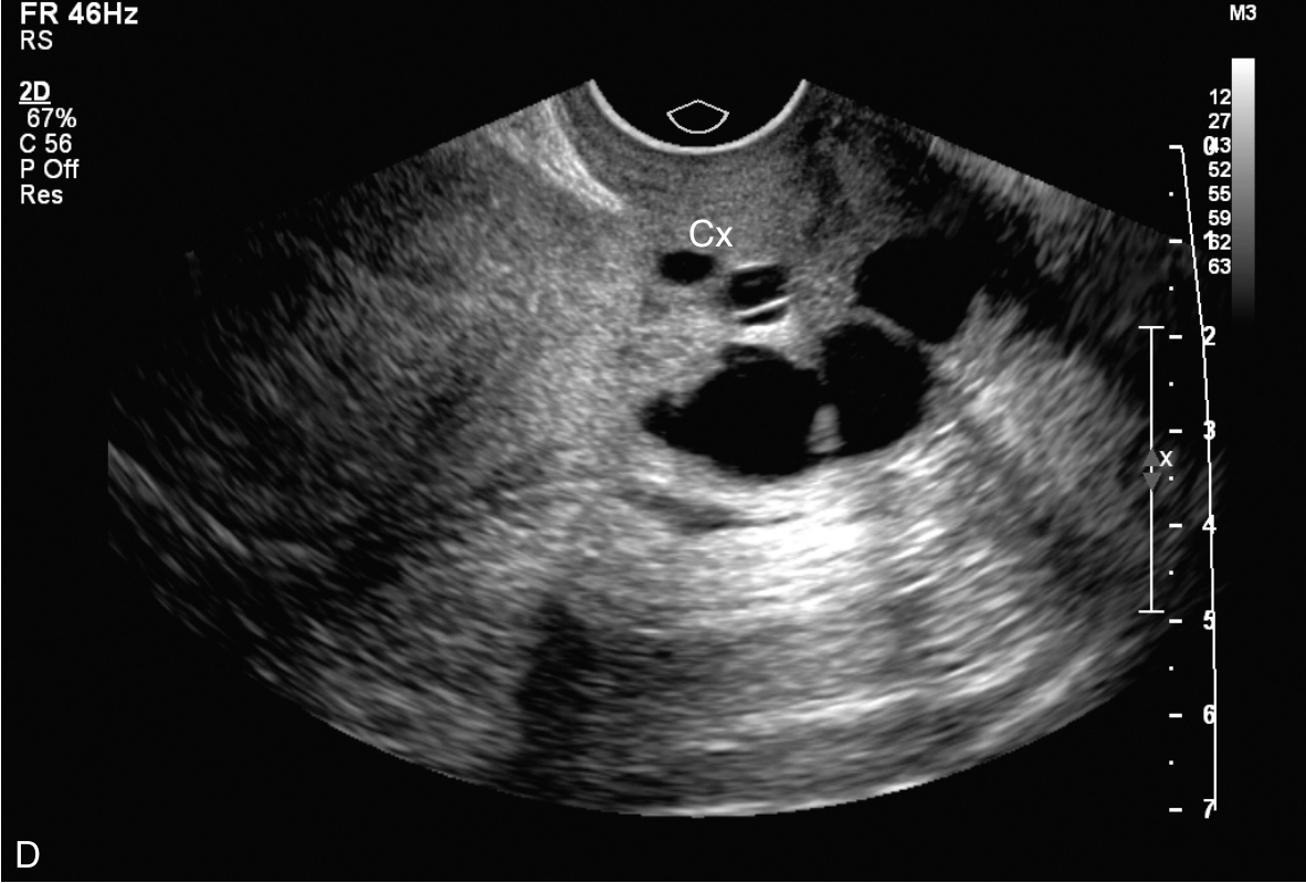 A.前位子宫的矢状切面;B.子宫横切面;C.右附件区囊性占位;D.宫颈囊性占位。UT:子宫;C:囊肿;Cx:宫颈。
