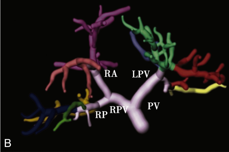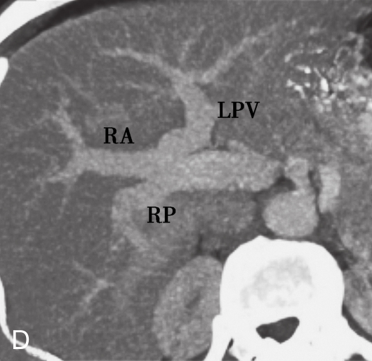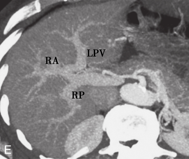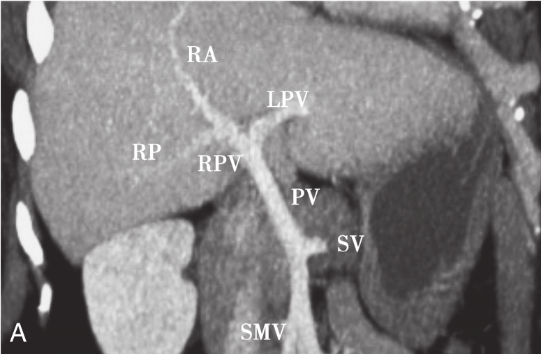 LPV.肝门静脉左支;RPV.肝门静脉右支;RA.右前支;RP.右后支;PV.门静脉;SV.脾静脉;SMV.肠系膜上静脉。