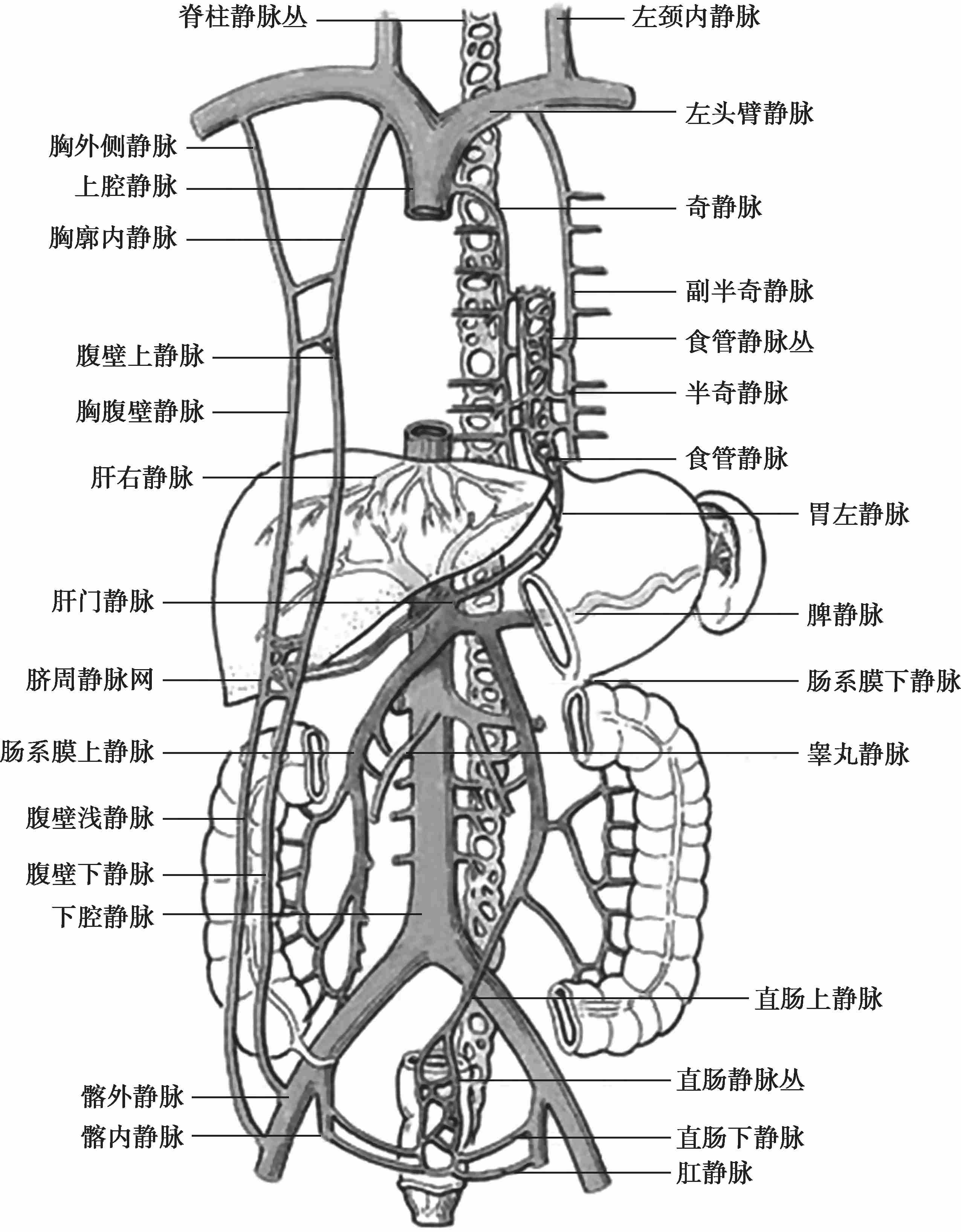 门静脉主要属支包括:① 肠系膜上静脉,位于同名动脉的右侧并与之伴行,除收集同名动脉分布区的血液外,还收纳胃十二指肠动脉分布区的血液。② 脾静脉,由脾的数支静脉组成,在胰腺后方走行,除收集同名动脉分布区的血液外,还接受肠系膜下静脉的汇入。③ 肠系膜下静脉,收纳同名动脉分布区的血液,居于同名动脉的左侧,在胰腺后面汇入脾静脉,有时汇入肠系膜上静脉或直接汇入门静脉(在脾静脉和肠系膜上静脉汇合的交角处)。④ 胃左静脉,胃冠状静脉,与同名动脉伴行并收集同名动脉分布区的血液,沿胃小弯左行再转向右后汇入门静脉主干。在贲门处食管静脉丛有小支汇入胃左静脉,其主支食管静脉汇入奇静脉或半奇静脉,从而使门静脉系和上腔静脉系沟通。⑤ 胃右静脉,与同名动脉伴行,汇入门静脉干。胃右静脉常接受幽门前静脉的汇入,该静脉在术中常用以作为确定幽门的标志。⑥ 胆囊静脉,收集胆囊壁的血液,汇入门静脉干或其右支。⑦ 附脐静脉,为数条细小的静脉,起于脐周静脉网,沿肝圆韧带走行,汇入门静脉或其左支(图6-1)。