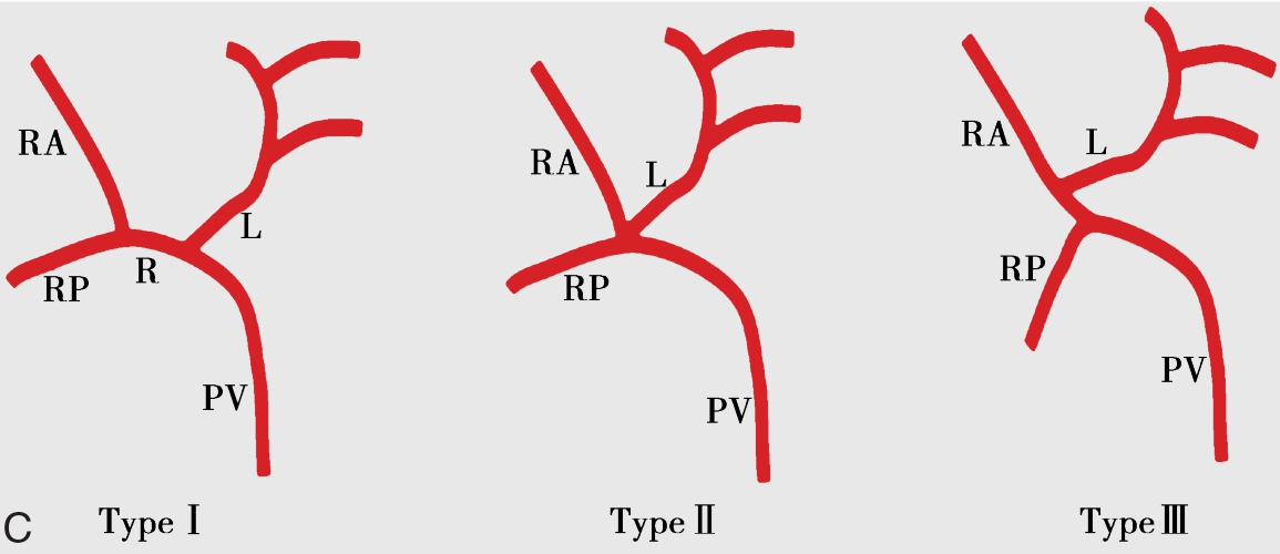 门静脉的变异虽不常见(10%~15%),但熟知门静脉变异对于术前PVE及手术切除的成功尤为重要。门静脉可分3叉(11%),也可以分4叉。只有1%的门静脉是没有分叉的,其中右侧门静脉肝内分支的变异类型较多(图6-2)。