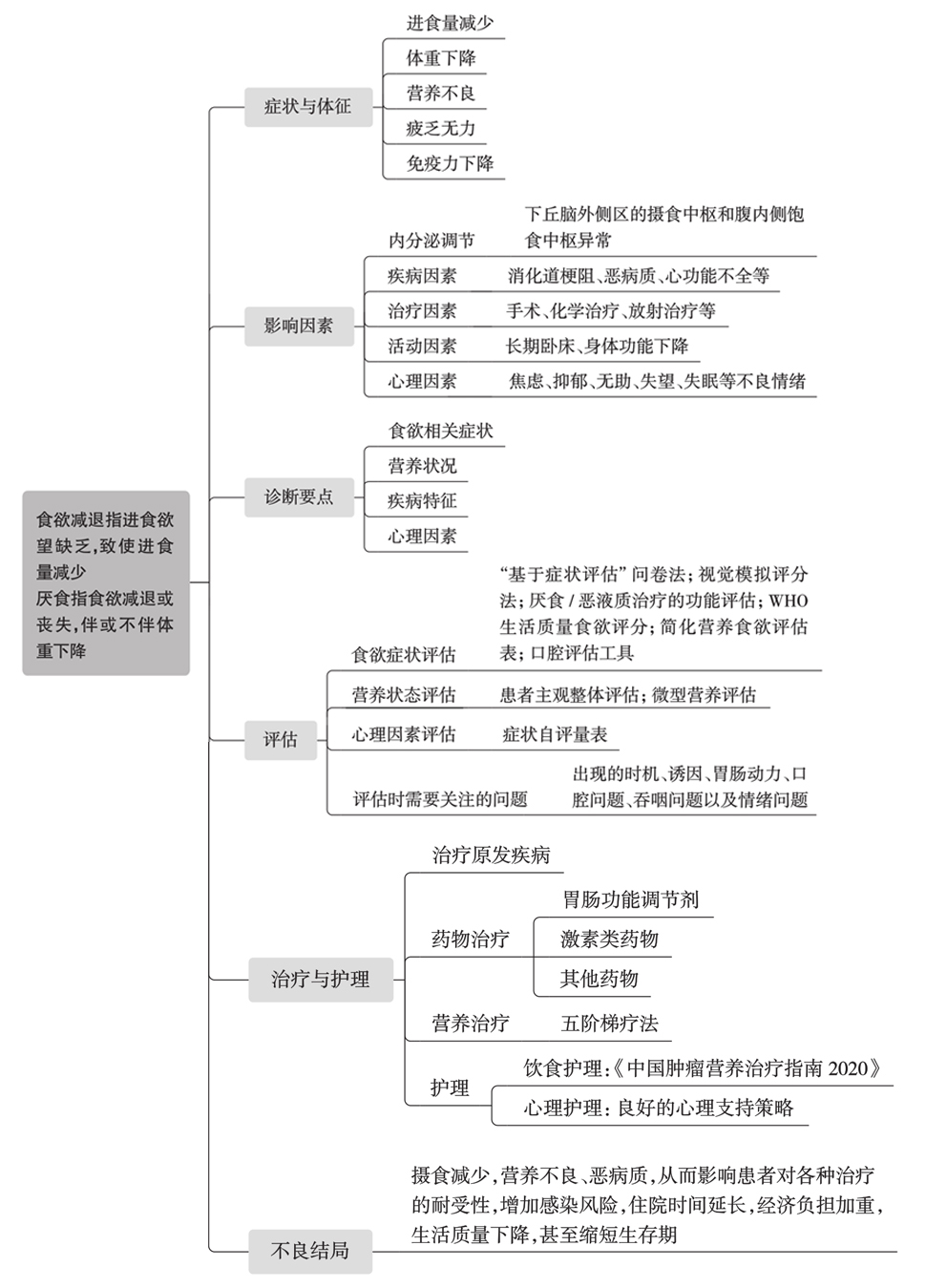由于食欲的复杂性,临床并无确切的参数或阈值能够评估和判断,且食欲减退影响因素众多,确定患者的食欲问题,可依据食欲相关症状的量表,并结合患者的营养状况、疾病特征、心理因素进行全面评估和诊断。