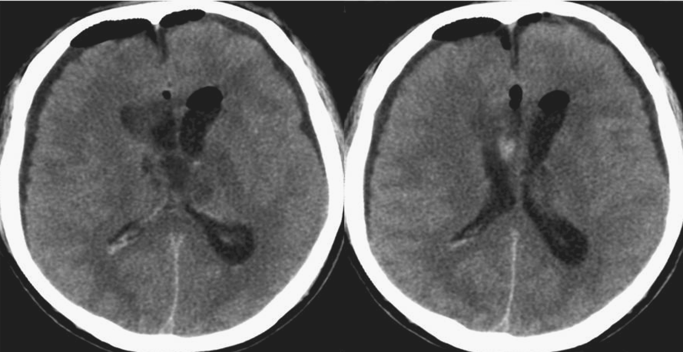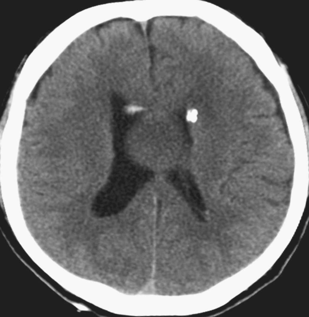 图5-1-4 脑室外引流术后CT表现(引流术后24小时)