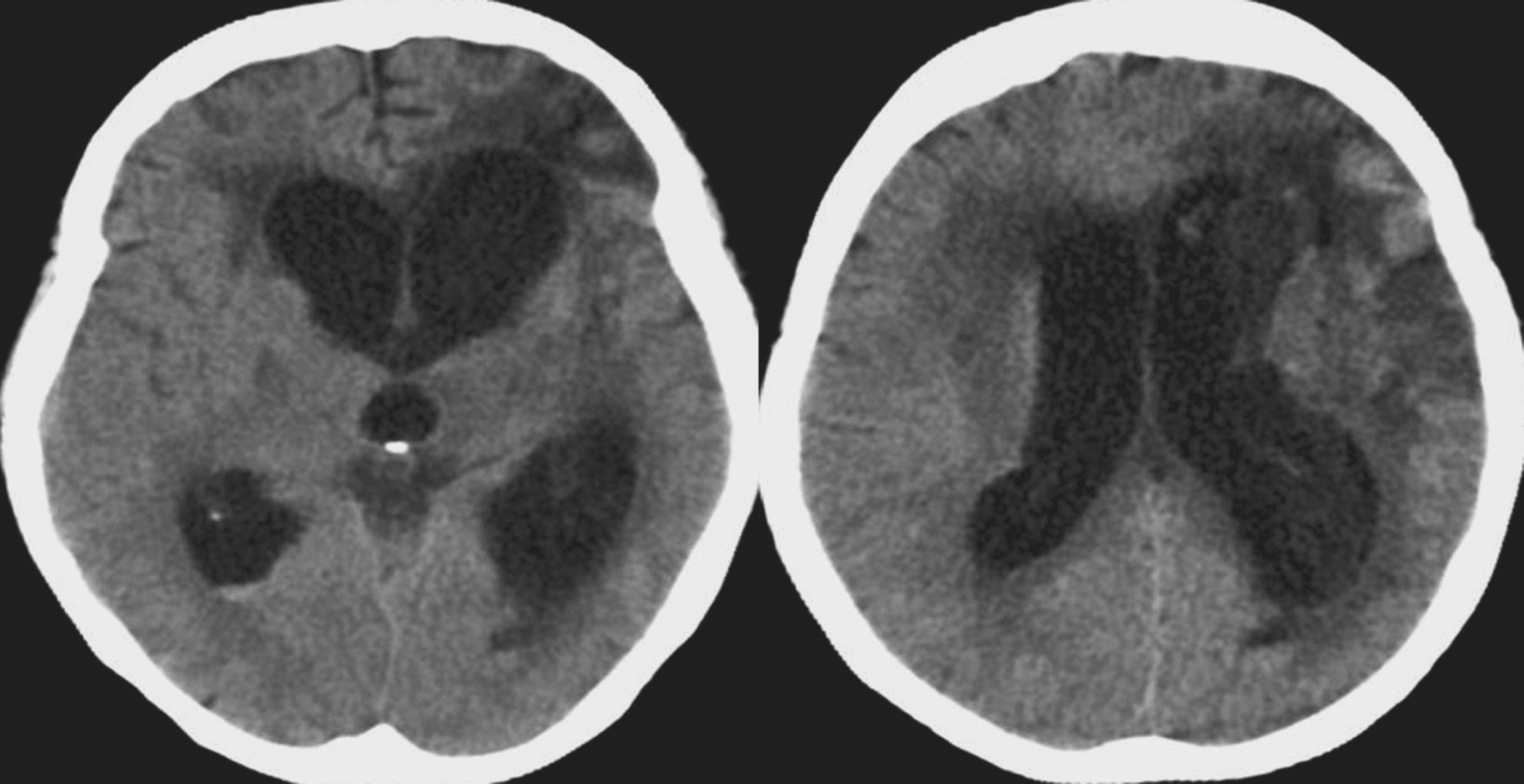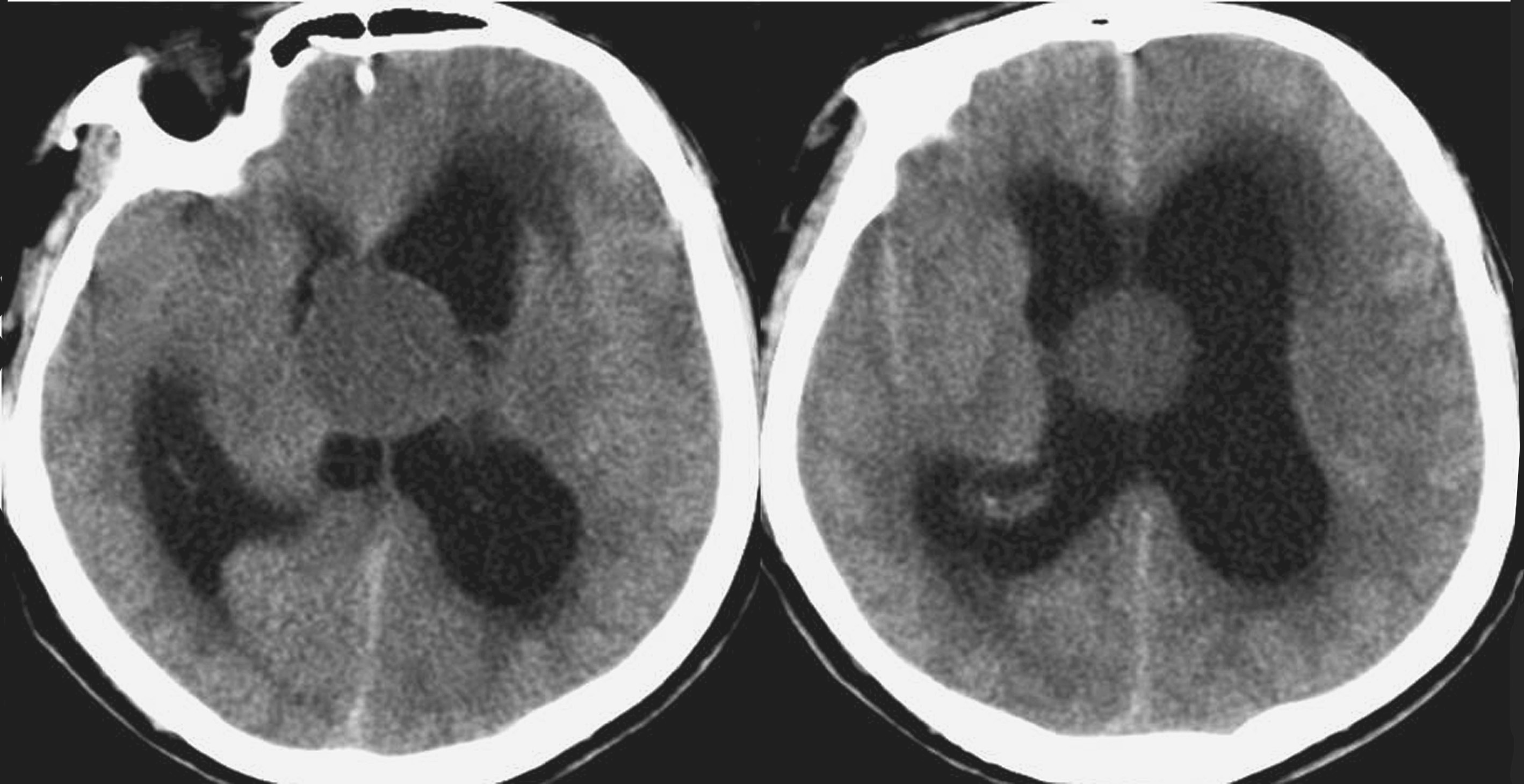 辅助检查:头颅CT(图5-1-3)提示第三脑室见类圆形低密度病变,脑室普遍扩大,脑沟消失,伴侧脑室周围低密度水肿带。