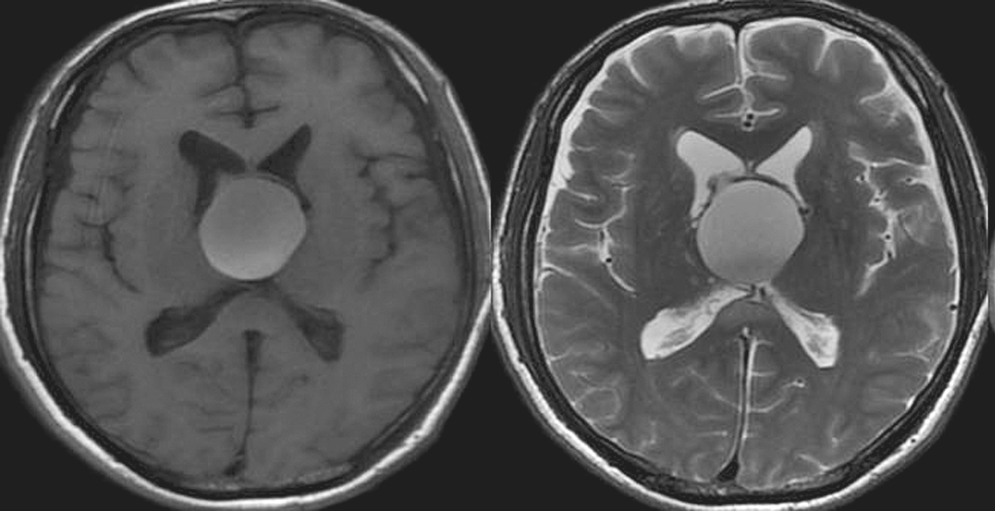 术后查体:神志恍惚,能简单回答问话。双瞳孔等大正圆,直径4.0mm,对光反射灵敏。颈软。四肢自主活动良好,肌张力略高。双侧Babinski征阴性。给予抗炎、脱水及对症治疗。术后24小时内复查头颅CT结果显示脑室系统明显变小(图5-1-4)。术后第3日患者神志清楚,问答合理。双侧脑室引流管通畅。术后第4日完善头颅MRI检查(图5-1-5)。双侧侧脑室外引流术后第6日于全身麻醉下行“经纵裂-胼胝体-穹窿间入路第三脑室内占位病变切除术”。手术过程顺利,复查头颅CT显示完全切除肿瘤,脑室大小基本正常(图5-1-6)。病理检查结果回报:胶样囊肿。患者2周后出院。目前随访恢复良好,未见肿瘤和脑积水复发。